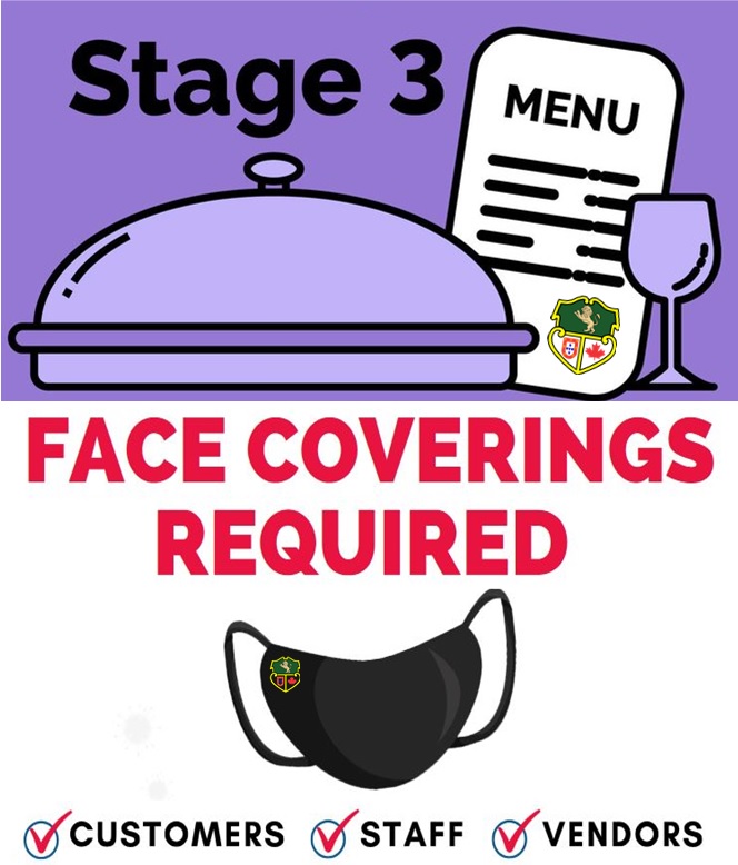 In accordance with Ontario’s reopening plan, as of FRI-17JUL2020 we will be permitted to serve food and drinks in our halls, with a limit of 50 people total due to the 2 metres of physical distancing and only permitting people within the same household at each table. Furthermore, food and drinks will be served to each table as buffet and bar services are still not permitted. Because of these limitations, we will continue to offer take-out, but quantities will be limited.⠀⠀