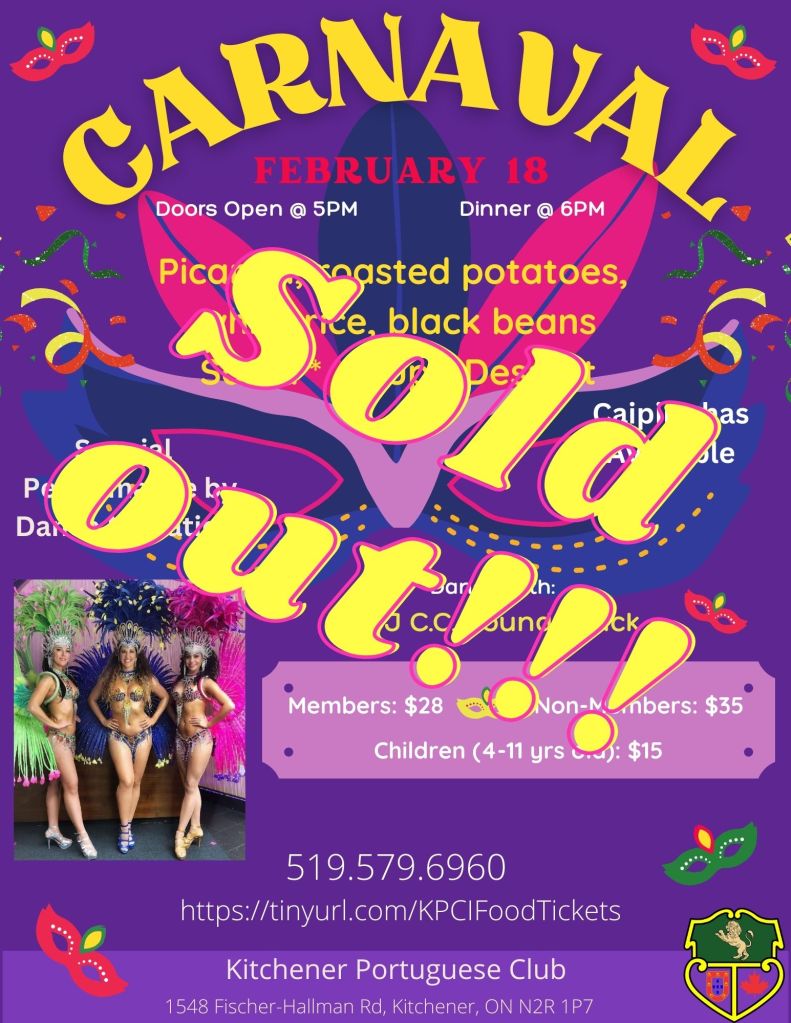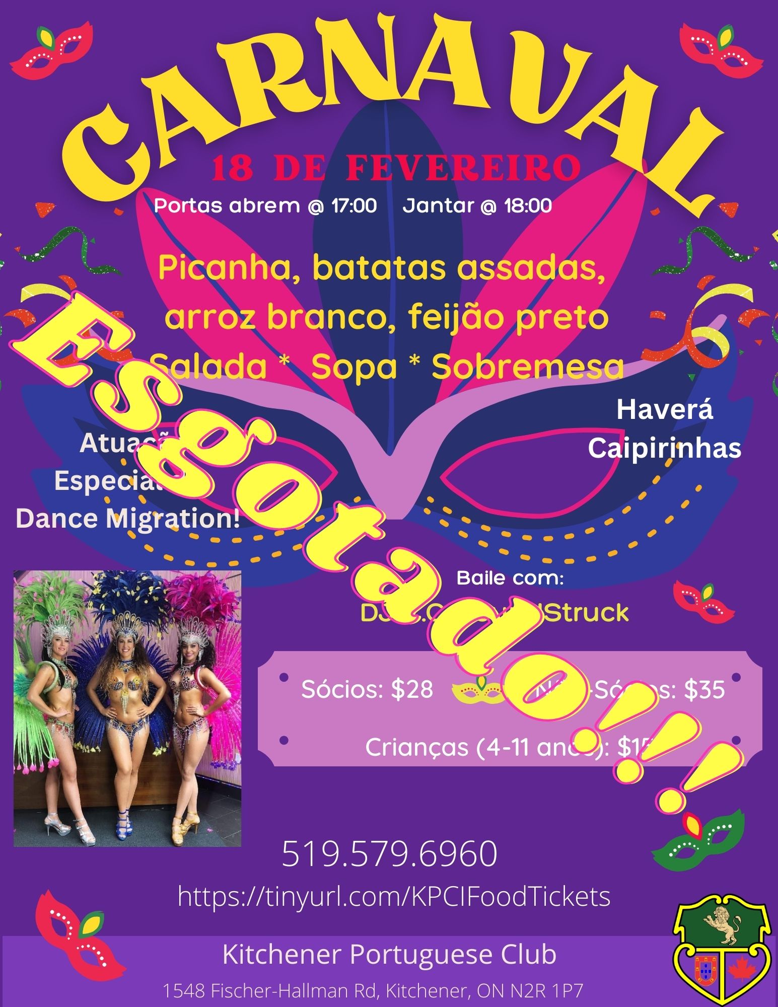 *** SOLD OUT *** JANTAR E BAILE DE CARNAVAL/CARNAVAL DINNER AND DANCE – FEV. 18, 2023! *** ESGOTADO *** Posted by danny36ca on February 4, 2023 Posted in: Past News and Events. Para bilhetes, contacte o Clube: 519-579-6960 ou visite este link. For tickets, contact the Club: 519-579-6960 or visit this link. Share this: Click to share on X (Opens in new window) X Click to share on Facebook (Opens in new window) Facebook Click to email a link to a friend (Opens in new window) Email Like Loading... Posts navigation ← FRIDAY’S DINNER/JANTAR DE SEXTA-FEIRA – February/Fevereiro 10, 2023. FRIDAY’S DINNER/JANTAR DE SEXTA-FEIRA – February/Fevereiro 17, 2023, →