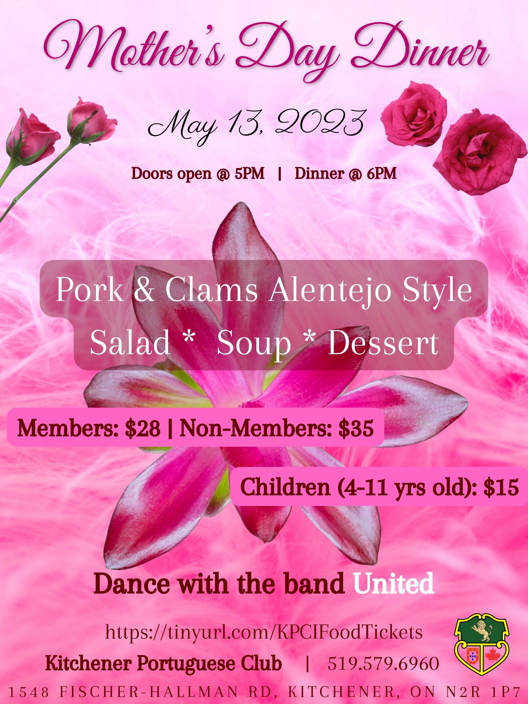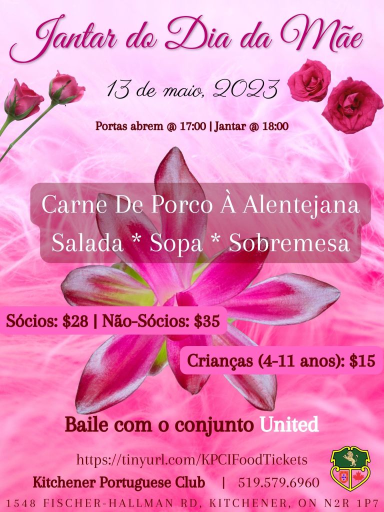 Jantar e Baile do Dia da Mãe/Mother’s Day Dinner & Dance – Sáb. 13 de Maio 2023! Posted by danny36ca on March 18, 2023 Posted in: Past News and Events. Para bilhetes, contacte o Clube: 519-579-6960 ou visite este link. For tickets, contact the Club: 519-579-6960 or visit this link. Share this: Click to share on X (Opens in new window) X Click to share on Facebook (Opens in new window) Facebook Click to email a link to a friend (Opens in new window) Email Like Loading... Posts navigation ← Festa do Sócio/Members Dinner & Dance – Sáb. 22 de Abril 2023 FRIDAY’S DINNER/JANTAR DE SEXTA-FEIRA – March/Março 31, 2023 →