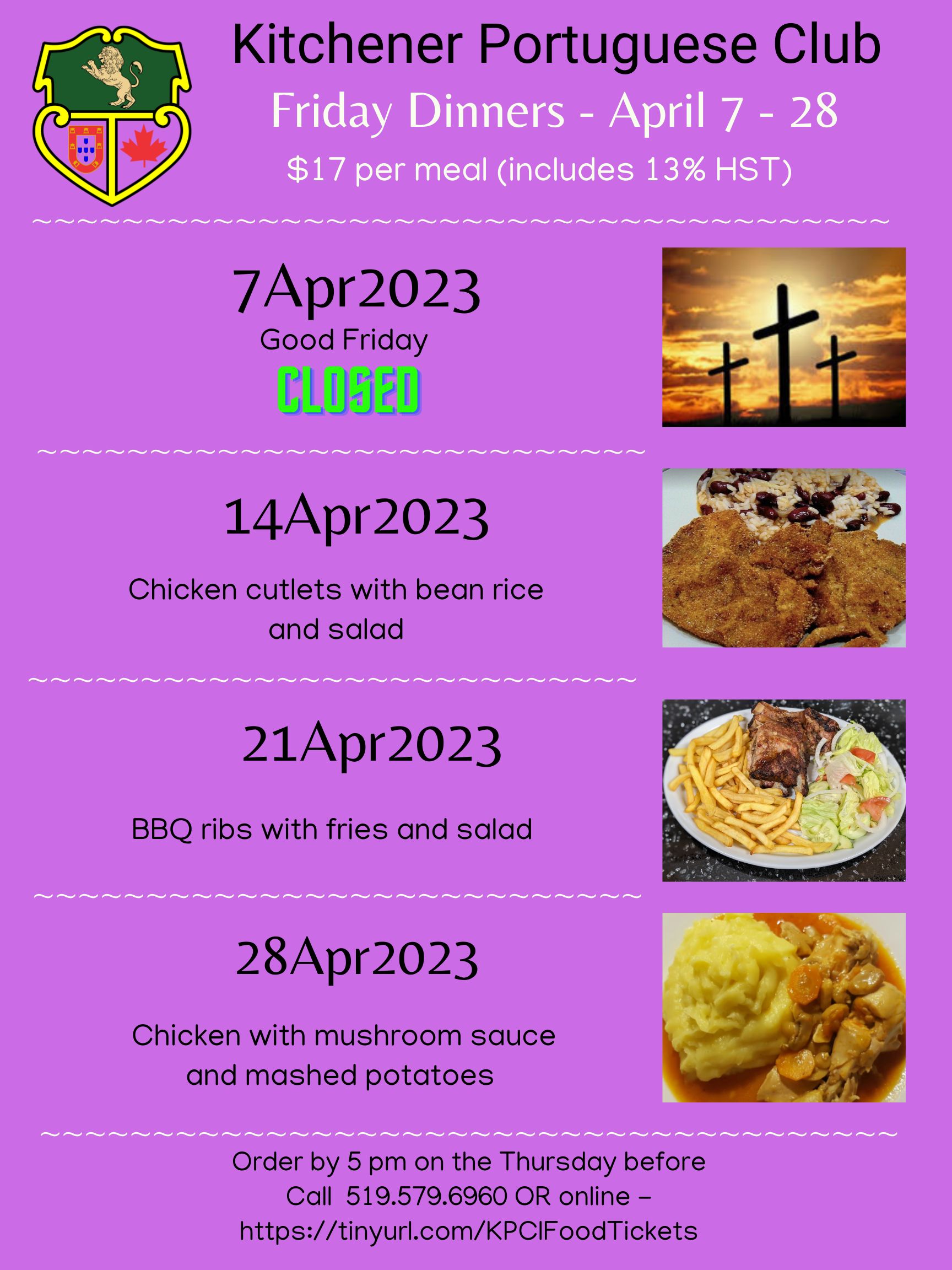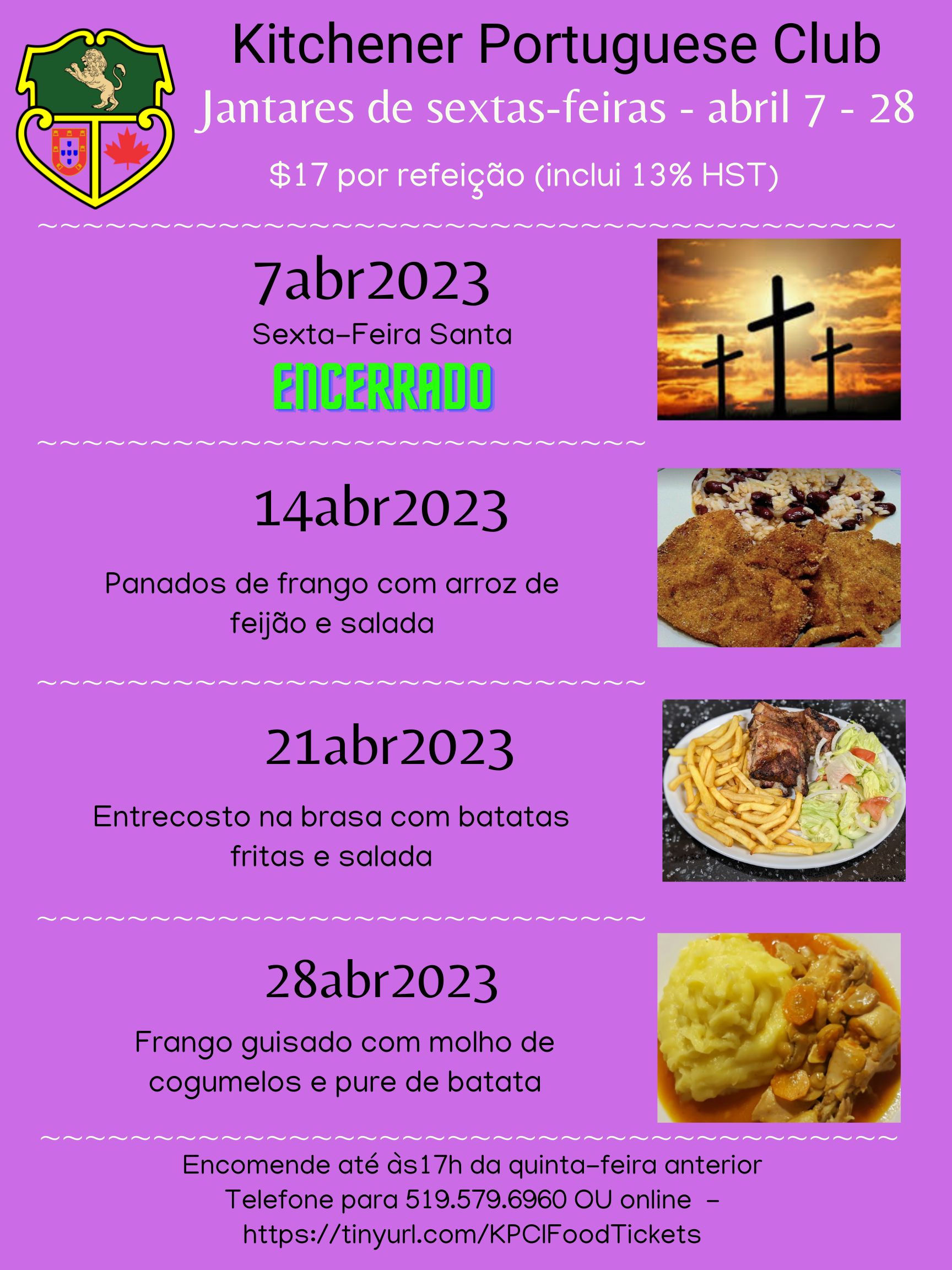 Friday’s Dinner Specials/Jantars das Sextas-Feiras – April/Abril 2023! Posted by danny36ca on April 8, 2023 Posted in: Friday Dinners. Click here to order online Clique aqui para encomendar online Share this: Click to share on X (Opens in new window) X Click to share on Facebook (Opens in new window) Facebook Click to email a link to a friend (Opens in new window) Email Like Loading... Posts navigation ← FRIDAY’S DINNER/JANTAR DE SEXTA-FEIRA – March/Março 31, 2023 FRIDAY’S DINNER/JANTAR DE SEXTA-FEIRA – APRIL/ABRIL 14, 2023! →