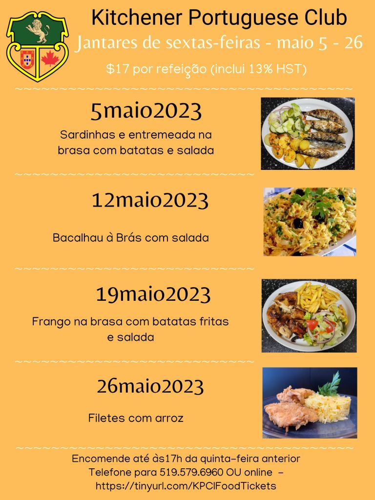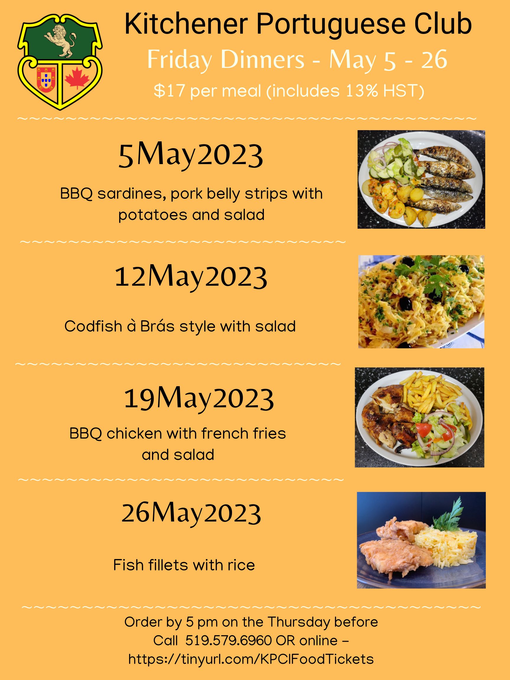 Friday’s Dinner Specials/Jantars das Sextas-Feiras – May/Maio 2023! Posted by danny36ca on April 29, 2023 Posted in: Friday Dinners. Click here to order online Clique aqui para encomendar online Share this: Click to share on X (Opens in new window) X Click to share on Facebook (Opens in new window) Facebook Click to email a link to a friend (Opens in new window) Email Like Loading... Posts navigation ← FRIDAY’S DINNER/JANTAR DE SEXTA-FEIRA – April/Abril 28, 2023! FRIDAY’S DINNER/JANTAR DE SEXTA-FEIRA – May/Maio 5, 2023! →