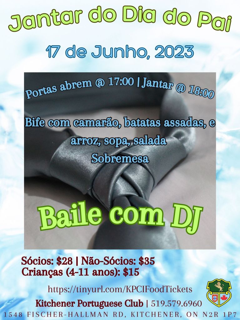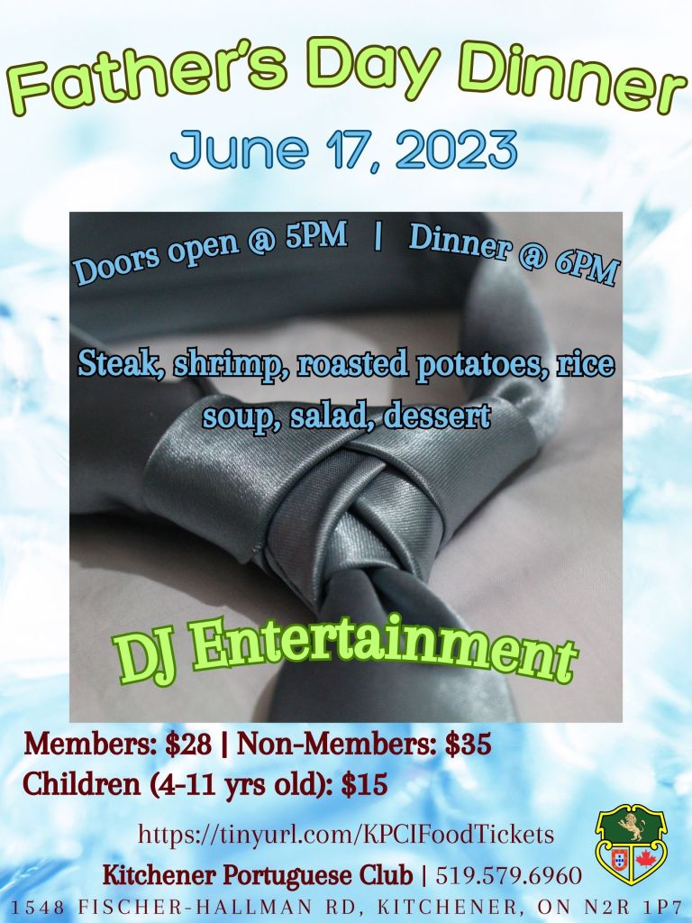 Jantar e Baile do Dia do Pai/Father’s Day Dinner & Dance – Dia 17 de Junho/June 17th, 2023. Posted by danny36ca on May 14, 2023 Posted in: Past News and Events. Para bilhetes, contacte o Clube: 519-579-6960 ou visite este link. For tickets, contact the Club: 519-579-6960 or visit this link. Share this: Click to share on X (Opens in new window) X Click to share on Facebook (Opens in new window) Facebook Click to email a link to a friend (Opens in new window) Email Like Loading... Posts navigation ← FRIDAY’S DINNER/JANTAR DE SEXTA-FEIRA – May/Maio 19, 2023. FRIDAY’S DINNER/JANTAR DE SEXTA-FEIRA – May/Maio 26, 2023. →