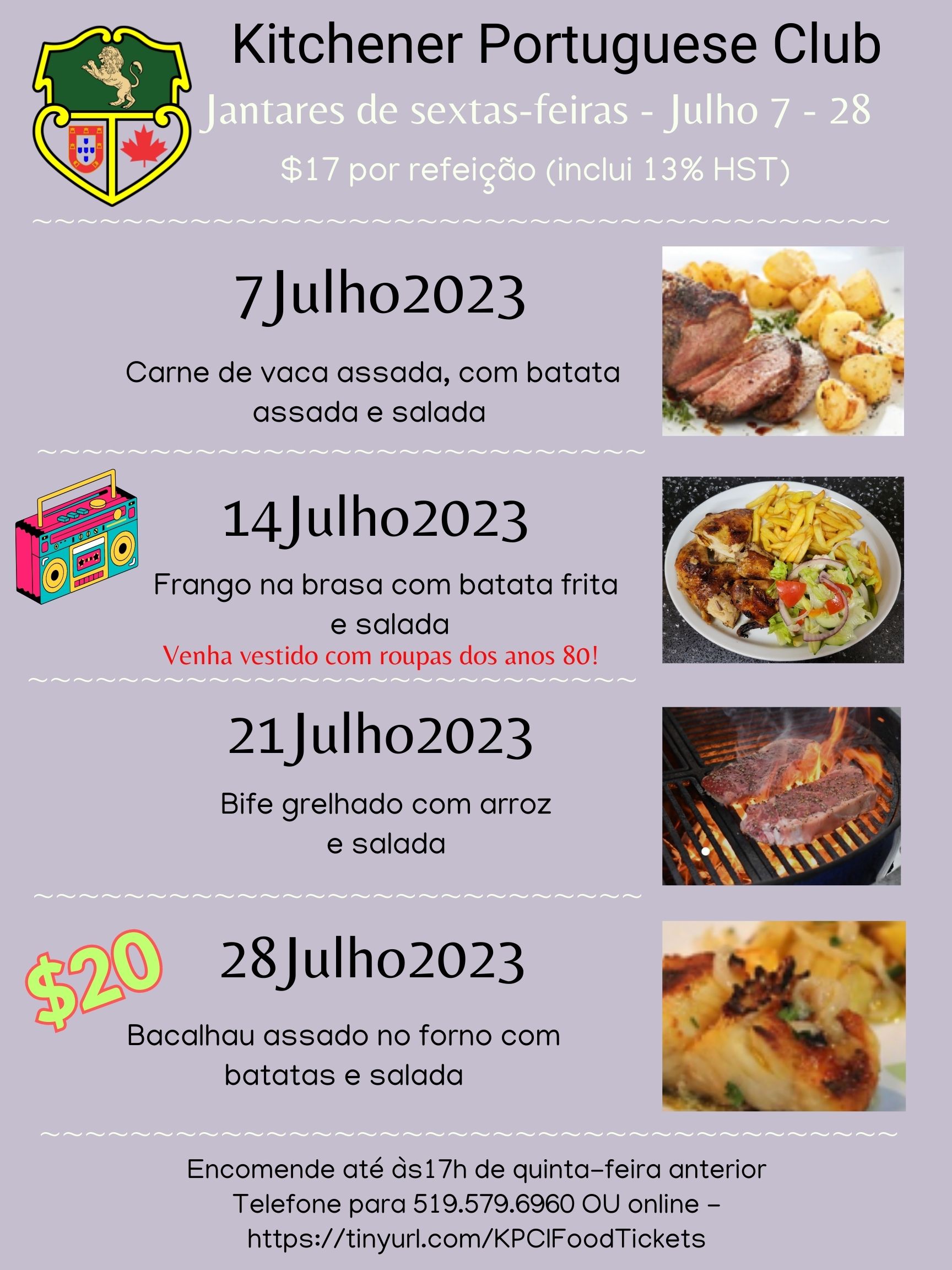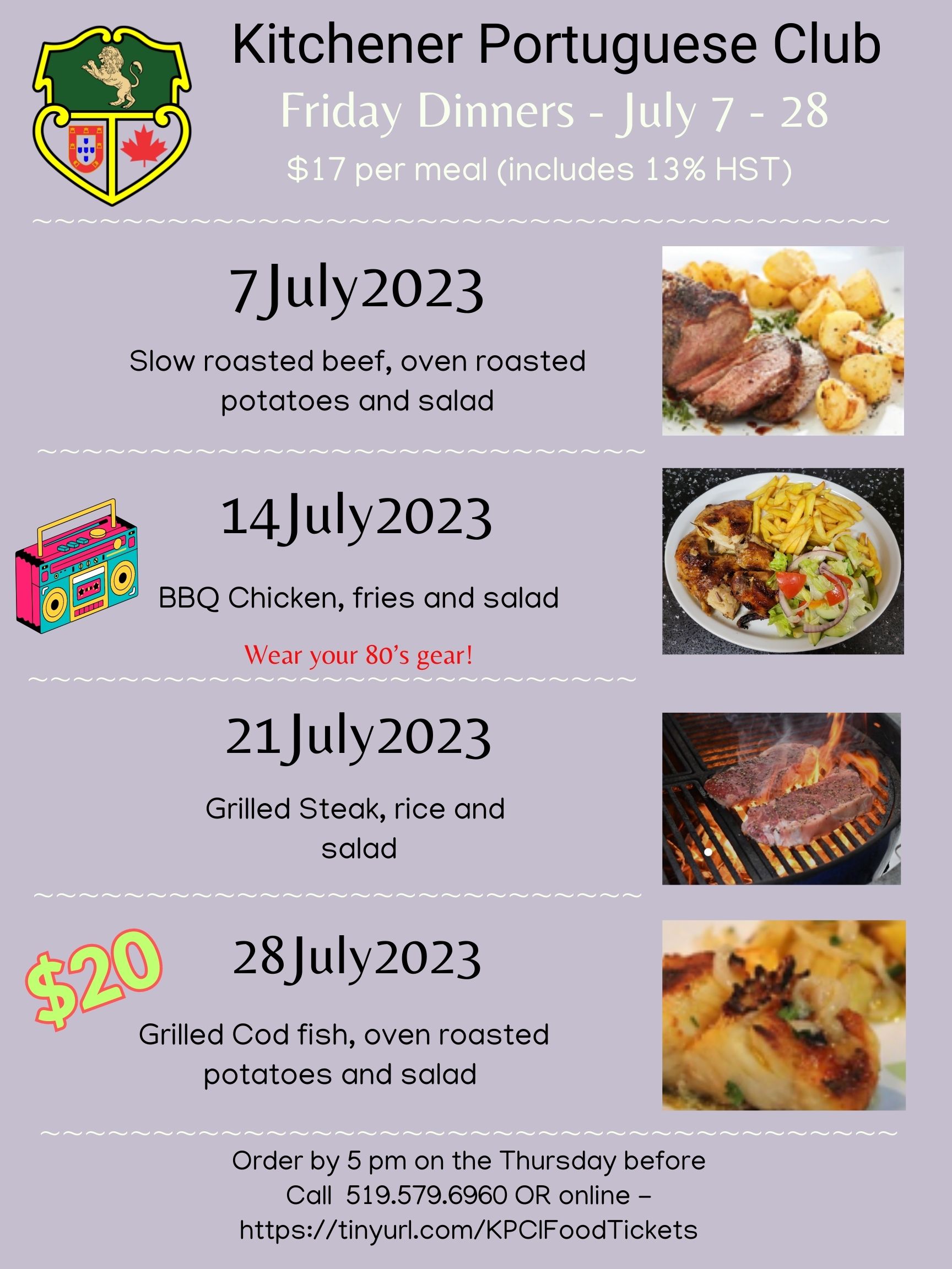 Friday’s Dinner Specials/Jantars das Sextas-Feiras – July/Julho 2023! Posted by danny36ca on July 1, 2023 Posted in: Friday Dinners. Click here to order online Clique aqui para encomendar online Share this: Click to share on X (Opens in new window) X Click to share on Facebook (Opens in new window) Facebook Click to email a link to a friend (Opens in new window) Email Like Loading... Posts navigation ← TROPICAL NIGHT FRIDAY’S DINNER/JANTAR DE SEXTA-FEIRA – NOITE TROPICAL – June/Junho 23, 2023! FRIDAY’S DINNER/JANTAR DE SEXTA-FEIRA – July/Julho 7, 2023! →