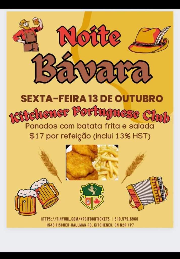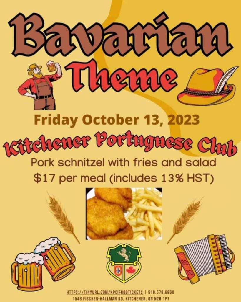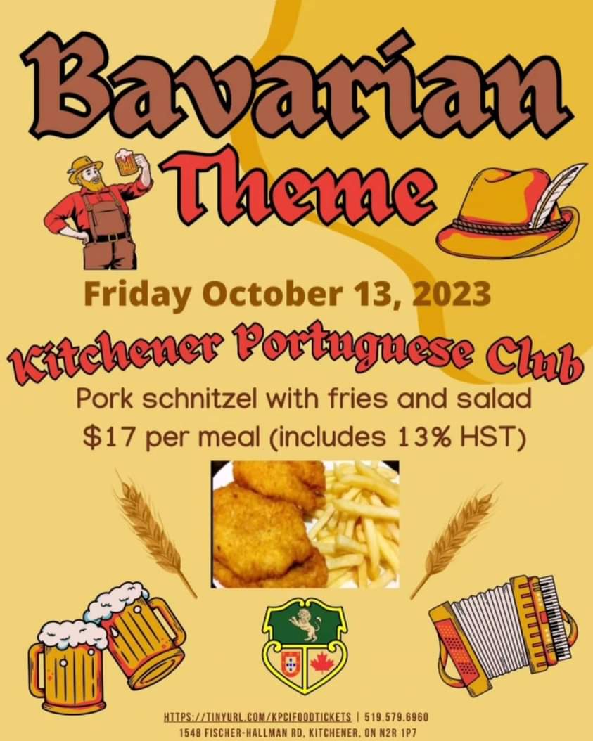Sexta-Feira, 13 de Outubro, vamos celebrar uma noite Bávara no salão pequeno do KPCI. Vamos servir (às 19 horas): panados com batata frita e salada, por $17!