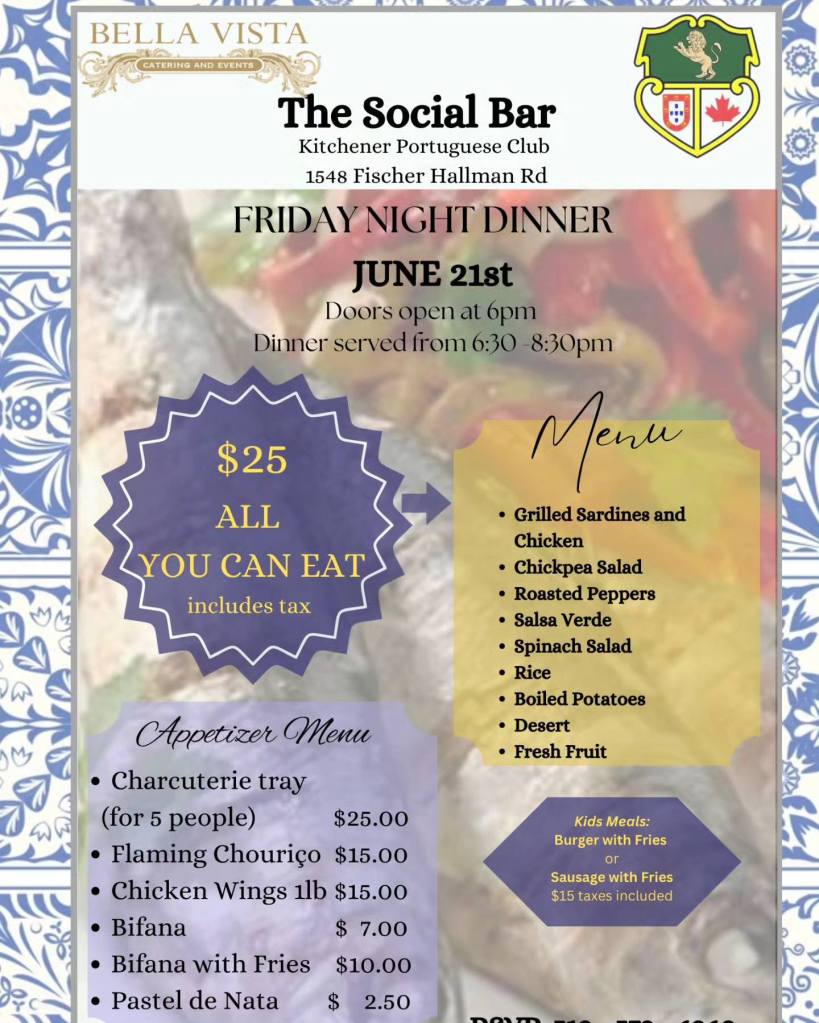 The Kitchener Portuguese Club in collaboration with Bella Vista Catering would like to see you all join us at our Social Bar for Friday dinner this week, June 21st. Doors open at 6PM. Price is $25/person for all you can eat!