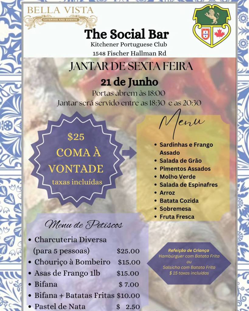 O clube portuguese de Kitchener em colaboração com o Bella Vista Catering gostaria que todos se juntassem a nós para o jantar na sexta-feira dia 21 de junho no nosso Social Bar. As portas abrem às 18h. O preço é de $25 /pessoa para comer à vontade.