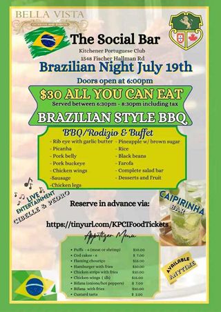 The Kitchener Portuguese Club in collaboration with Bella Vista Catering and Events would like to see you all join us at our Social Bar for Friday dinner this week, July 19th. Doors open at 6PM. Price is $30/person for all you can eat! We will have live entertainment as well with the talented duo Cibelle and Pedro!