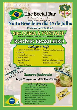 O clube portuguese de Kitchener em colaboração com o Bella Vista Catering gostaria que todos se juntassem a nós para o jantar na sexta-feira dia 19 de julho no nosso Social Bar. As portas abrem às 18h. O preço é de $30 /pessoa para comer à vontade. Teremos também música ao vivo com a dupla talentosa Cibelle e Pedro!