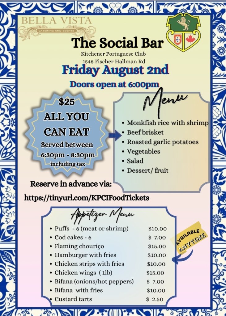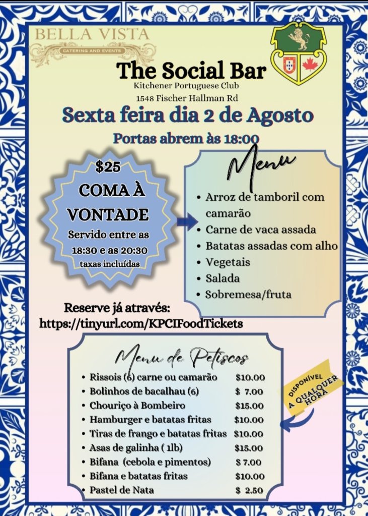 O clube portuguese de Kitchener em colaboração com o Bella Vista Catering gostaria que todos se juntassem a nós para o jantar na sexta-feira dia 2 de agosto no nosso Social Bar. As portas abrem às 18h. O preço é de $25 /pessoa para comer à vontade.