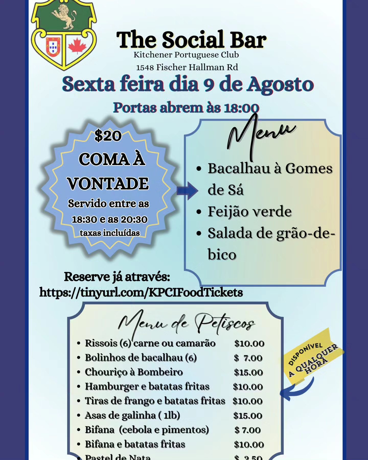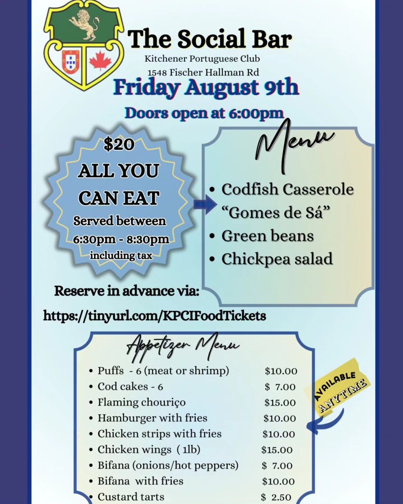 The Kitchener Portuguese Club, would like to see you all join us at our Social Bar for Friday dinner this week, August 9th.