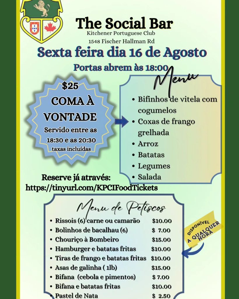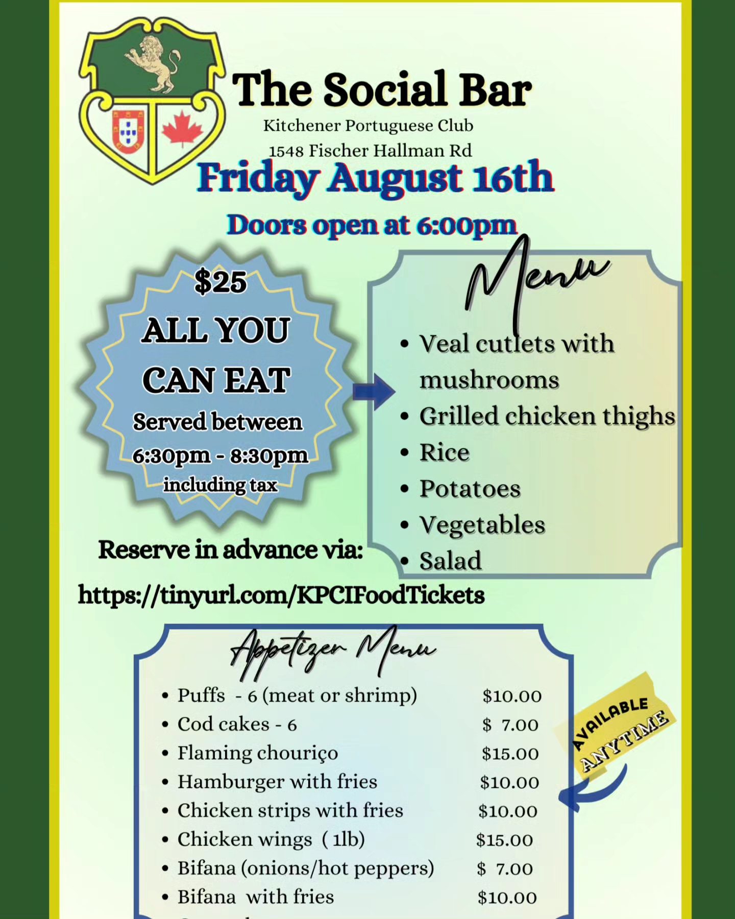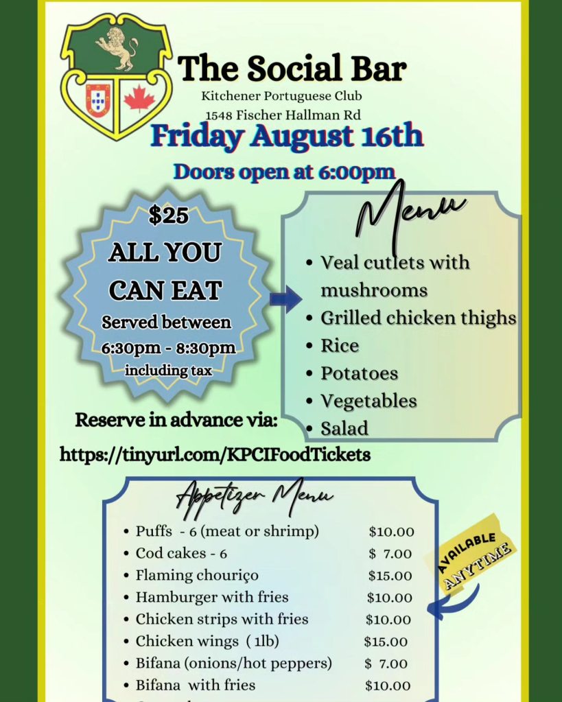 The Kitchener Portuguese Club would like to see you all join us at our Social Bar for Friday dinner this week, August 16th. Doors open at 6PM. Price is $25/person for all you can eat!!!!