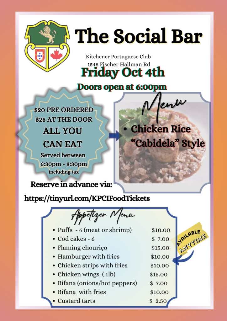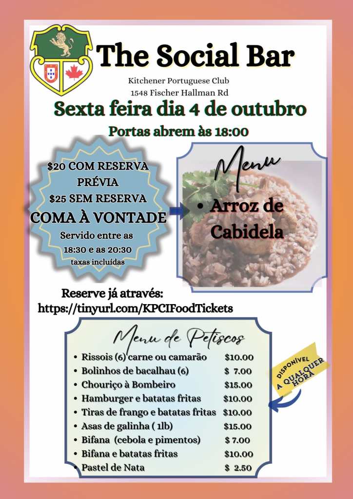 The Kitchener Portuguese Club, would like to see you all join us at our Social Bar for Friday dinner this week, October 4th. Doors open at 6PM. Price is $20/person for al you can eat when reserved in advance or $25 at the door without pre order !!!!