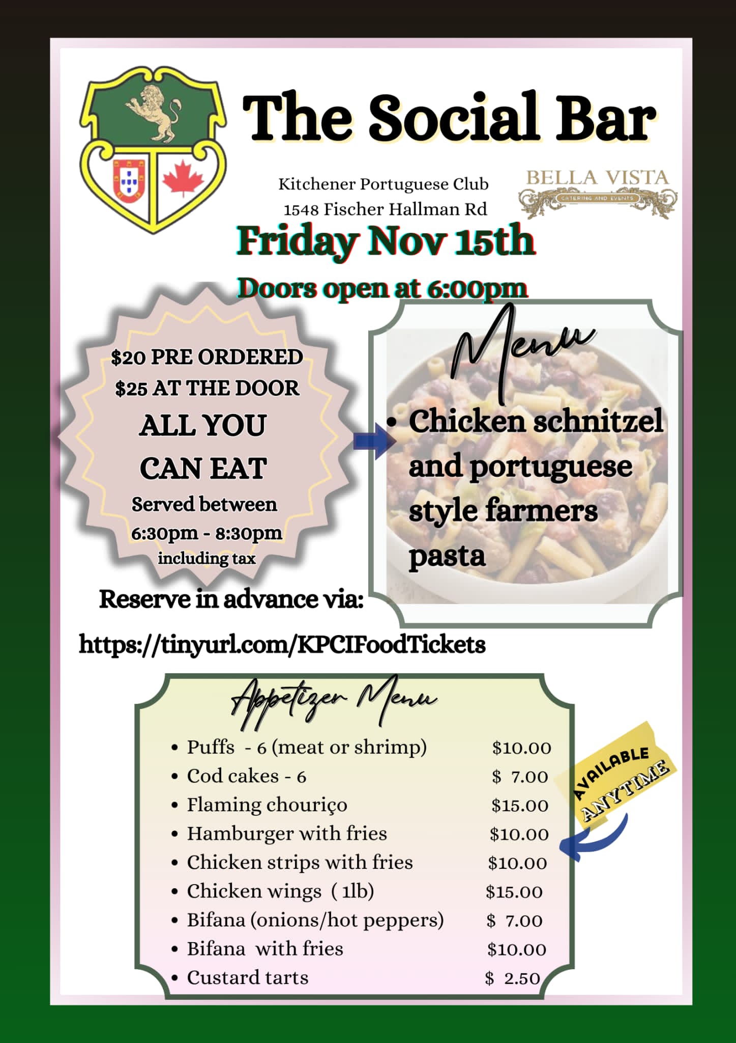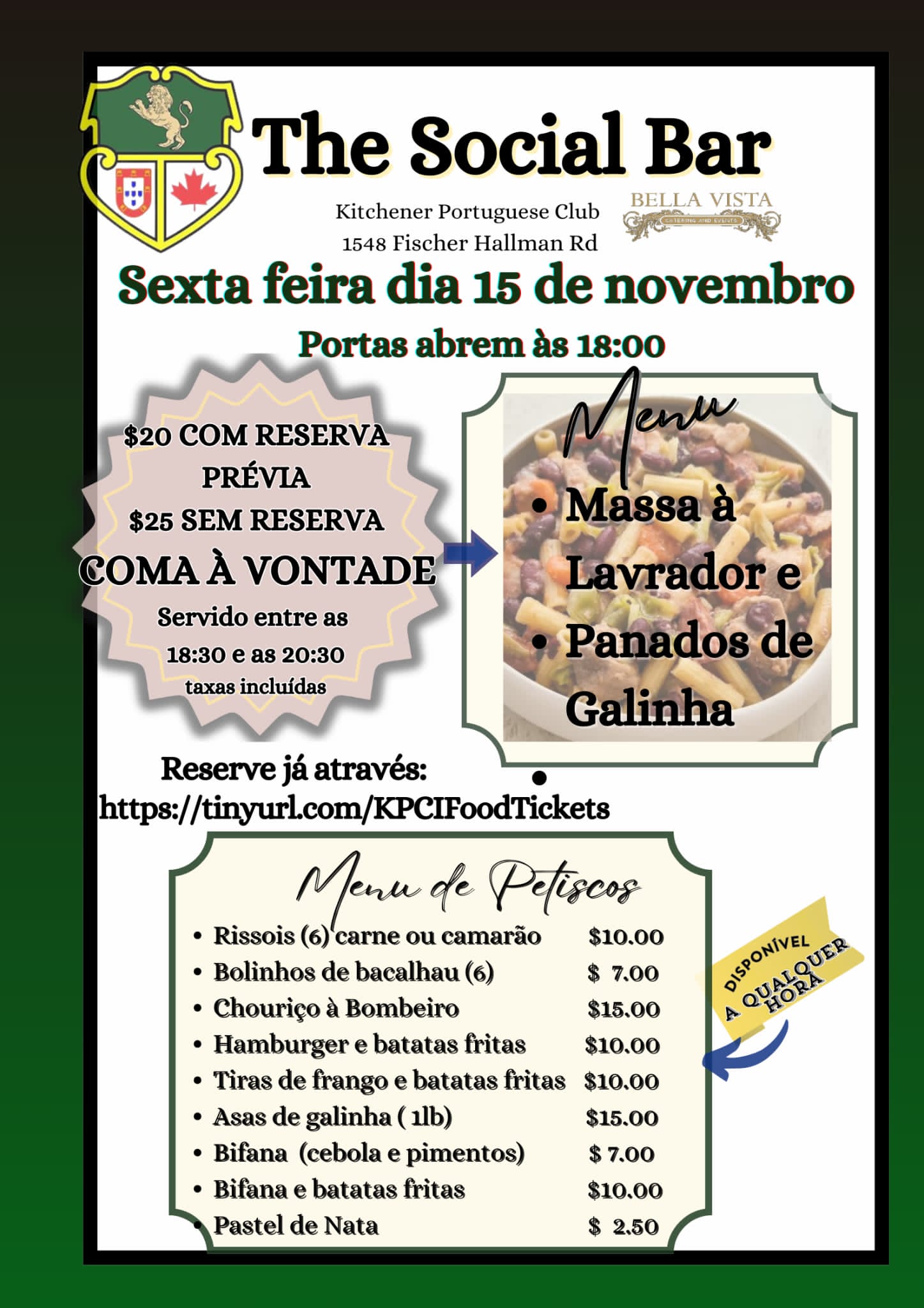 The Kitchener Portuguese Club, would like to see you all join us at our Social Bar for Friday dinner this week, November 15th.