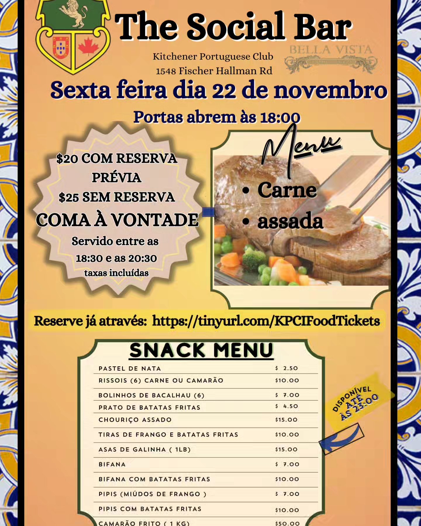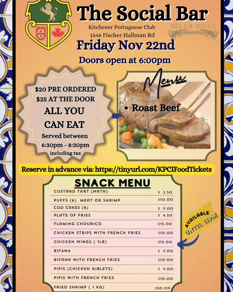The Kitchener Portuguese Club, would like to see you all join us at our Social Bar for Friday dinner this week, November 22nd.