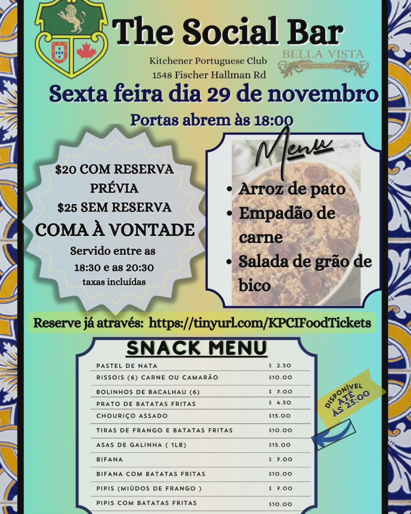 The Kitchener Portuguese Club, would like to see you all join us at our Social Bar for Friday dinner this week, November 29th.