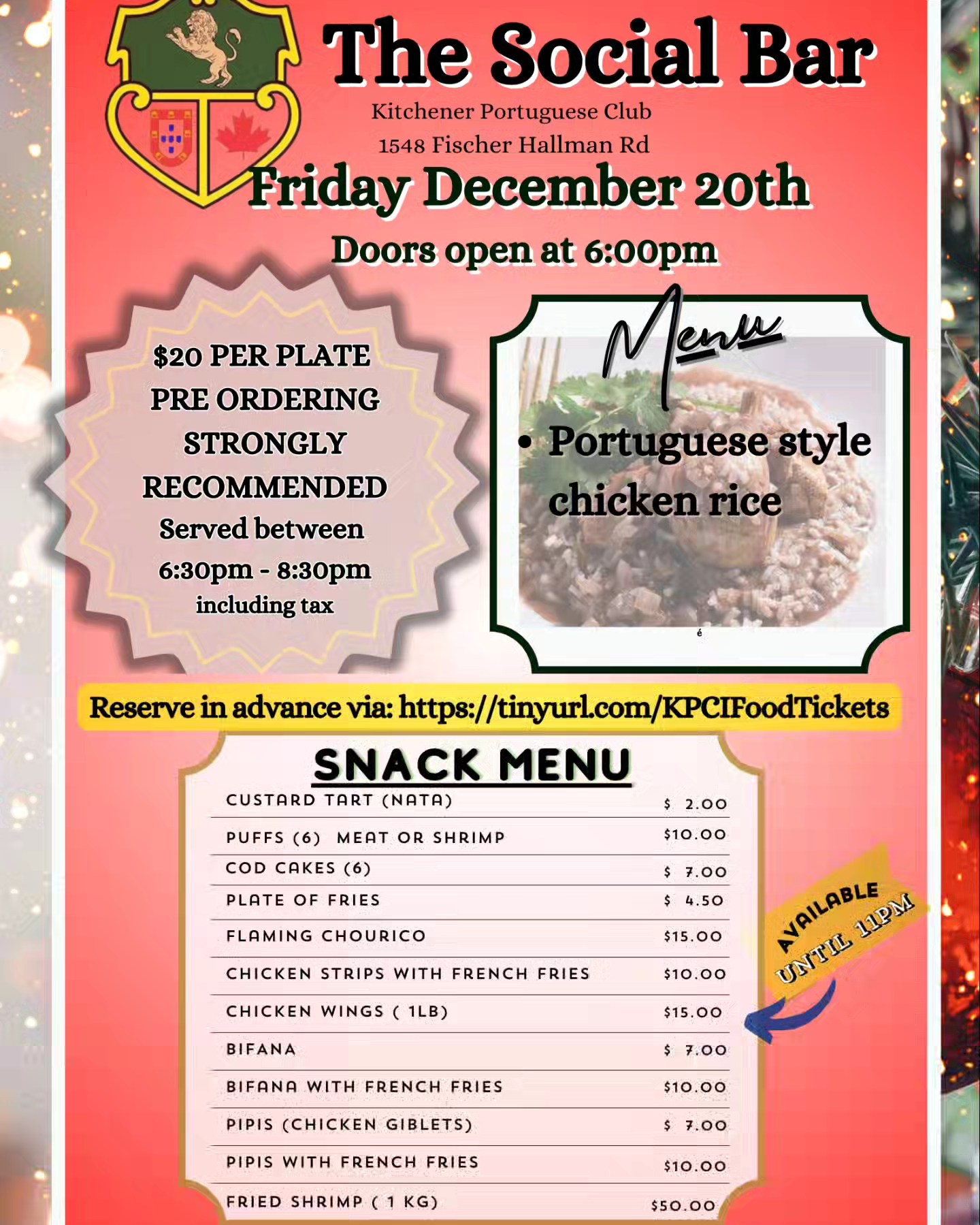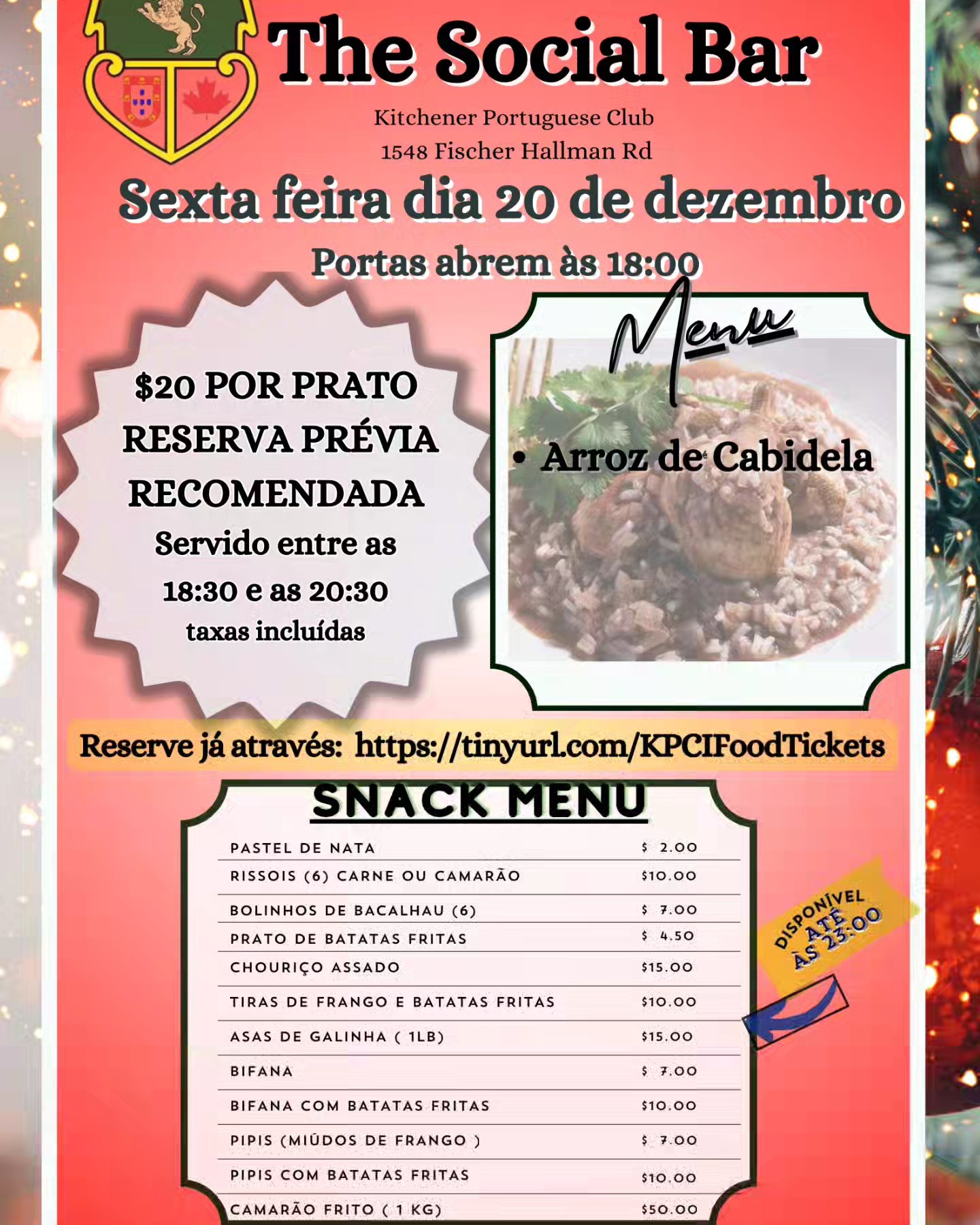 The Kitchener Portuguese Club, would like to see you all join us at our Social Bar for Friday dinner this week, December 20th.