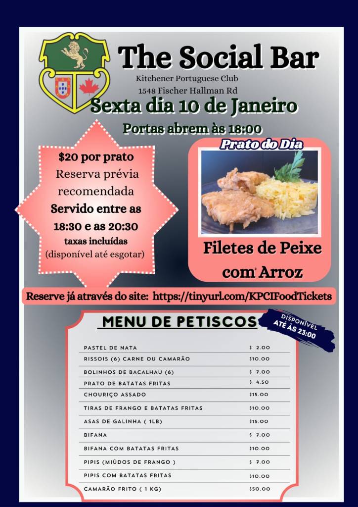 O clube portuguese de Kitchener gostaria que todos se juntassem a nós para o Primeiro jantar de sexta-feira deste Ano: dia 10 de Janeiro, nosso Social Bar.