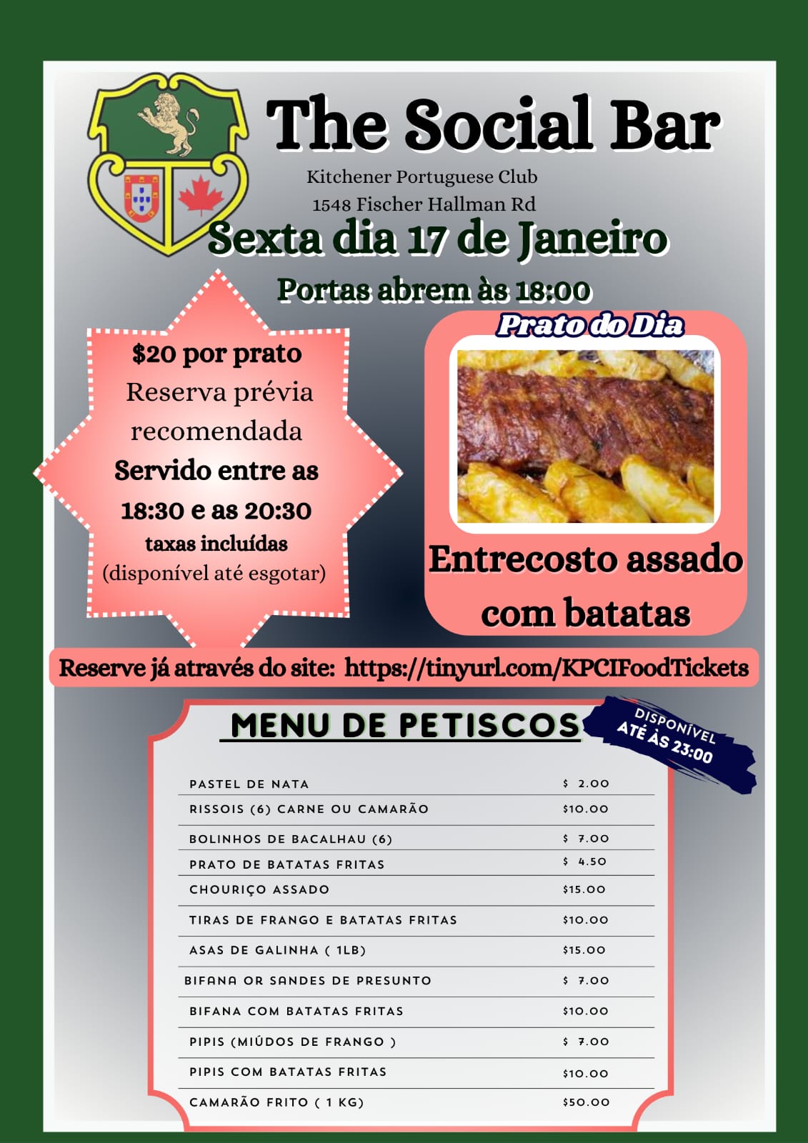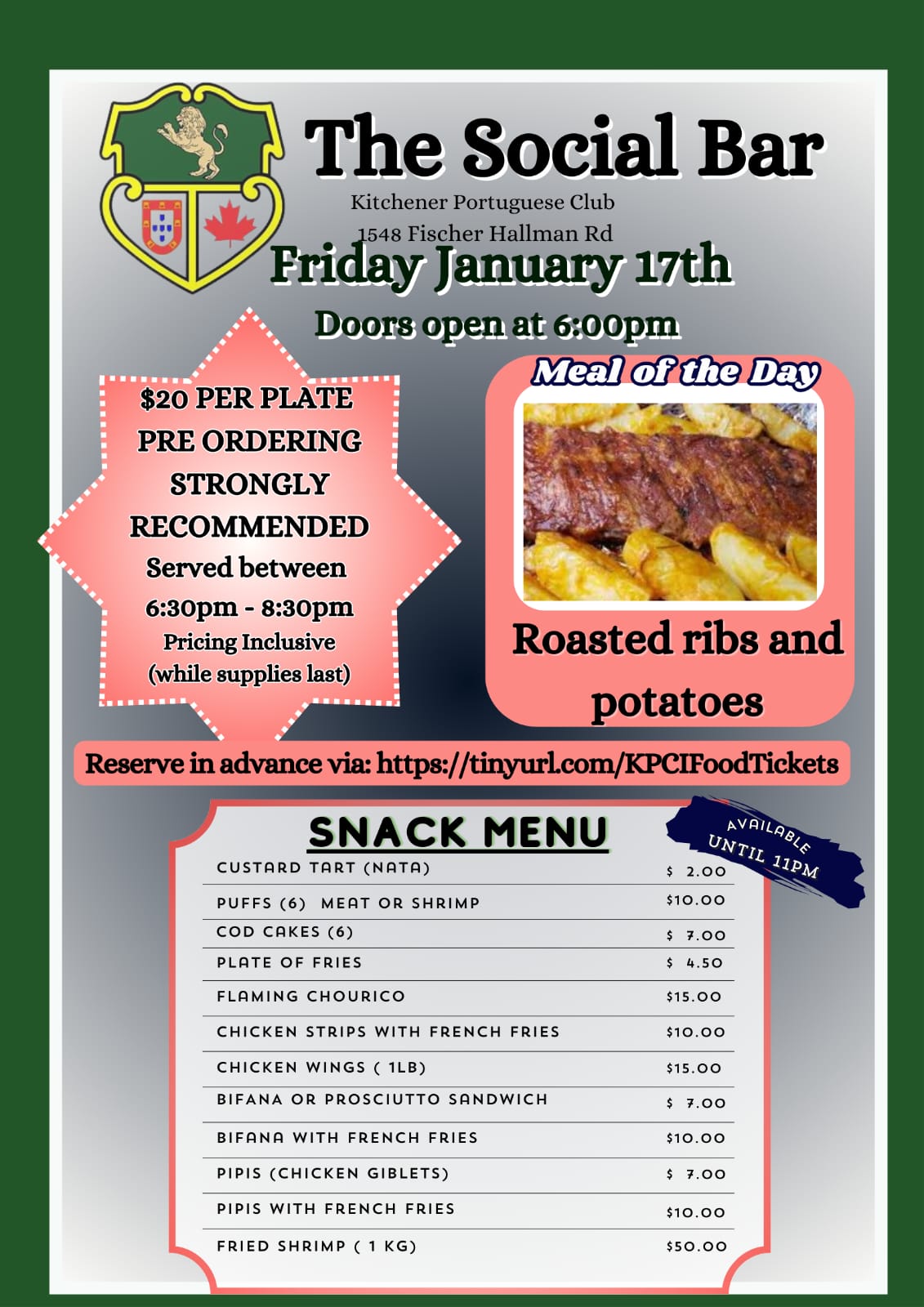 The Kitchener Portuguese Club, would like to see you all join us at our Social Bar for Friday dinner this week, January 17th!