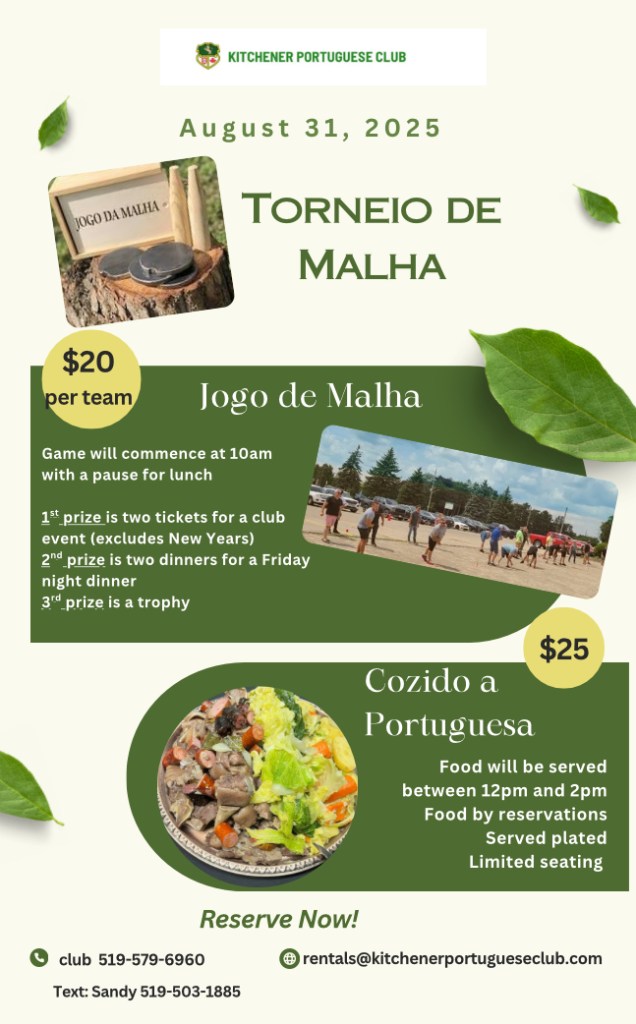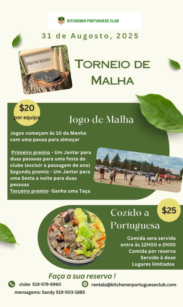 TORNEIO DE MALHA/MALHA TOURNAMENT – DOM./SUN. AGO./AUG. 31, 2025!! Posted by danny36ca on August 7, 2025 Posted in: Past News and Events. Share this: Click to share on X (Opens in new window) X Click to share on Facebook (Opens in new window) Facebook Click to email a link to a friend (Opens in new window) Email Like Loading... Posts navigation ← FRIDAY NIGHT DINNER/JANTAR DE SEXTA-FEIRA – Aug./Ago. 8. 2025. FRIDAY NIGHT DINNER/JANTAR DE SEXTA-FEIRA – Aug./Ago. 15. 2025. →