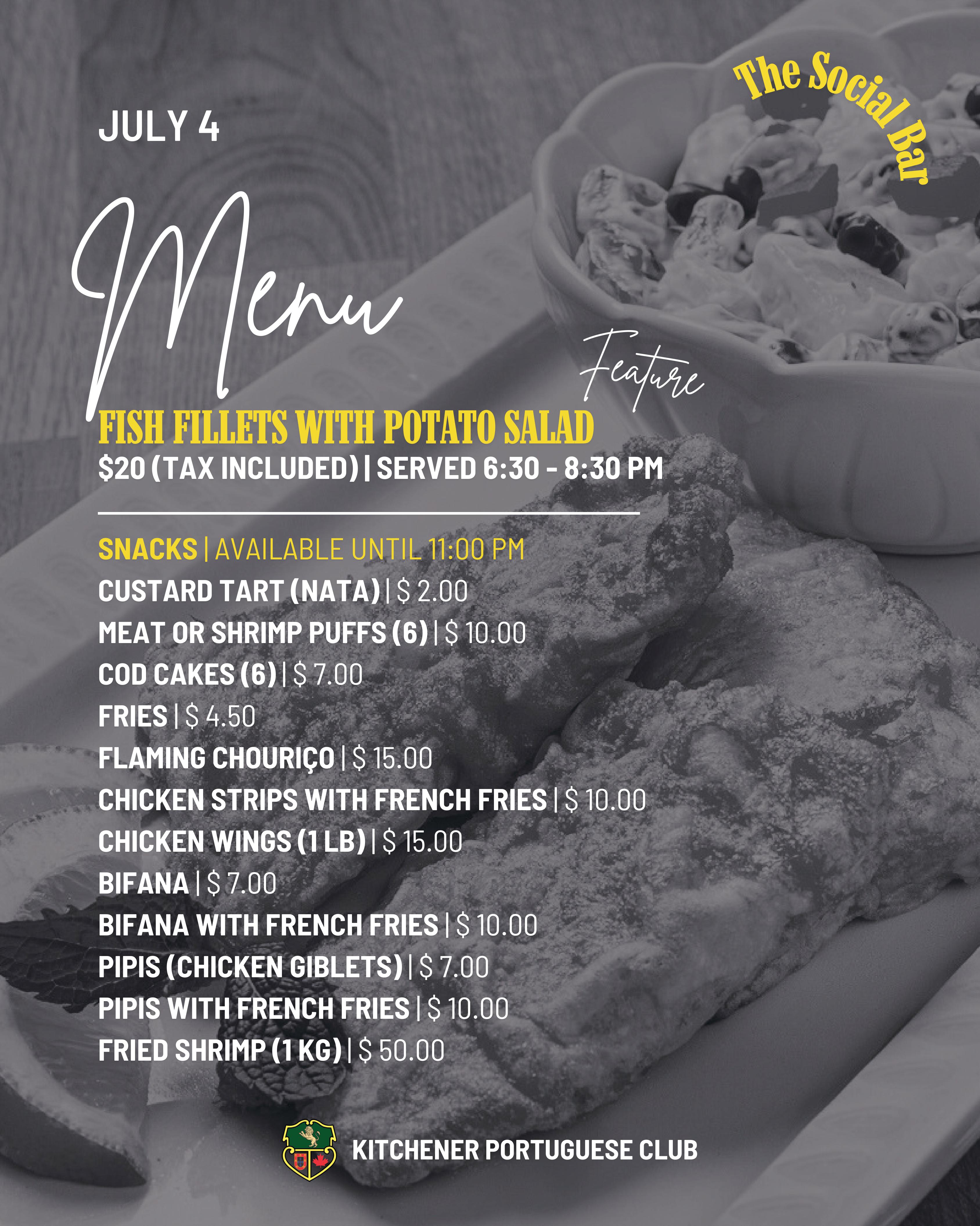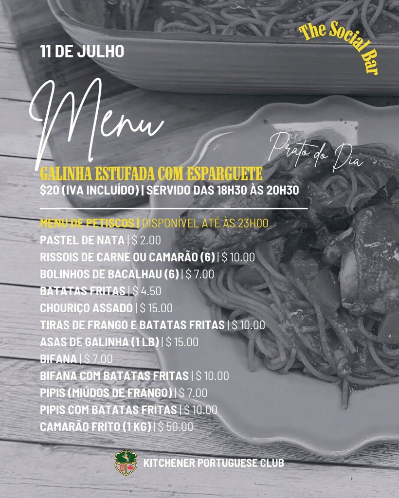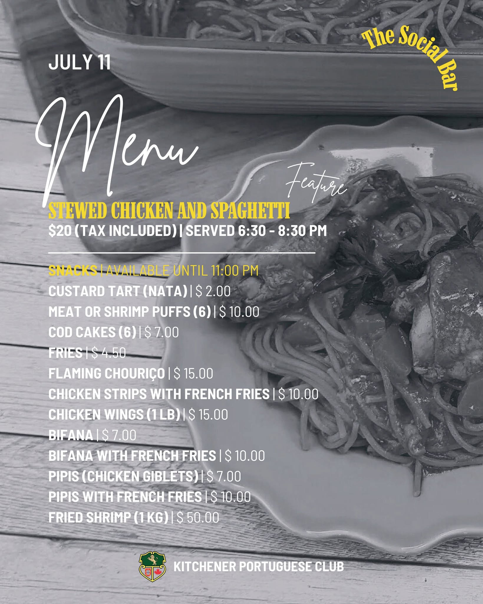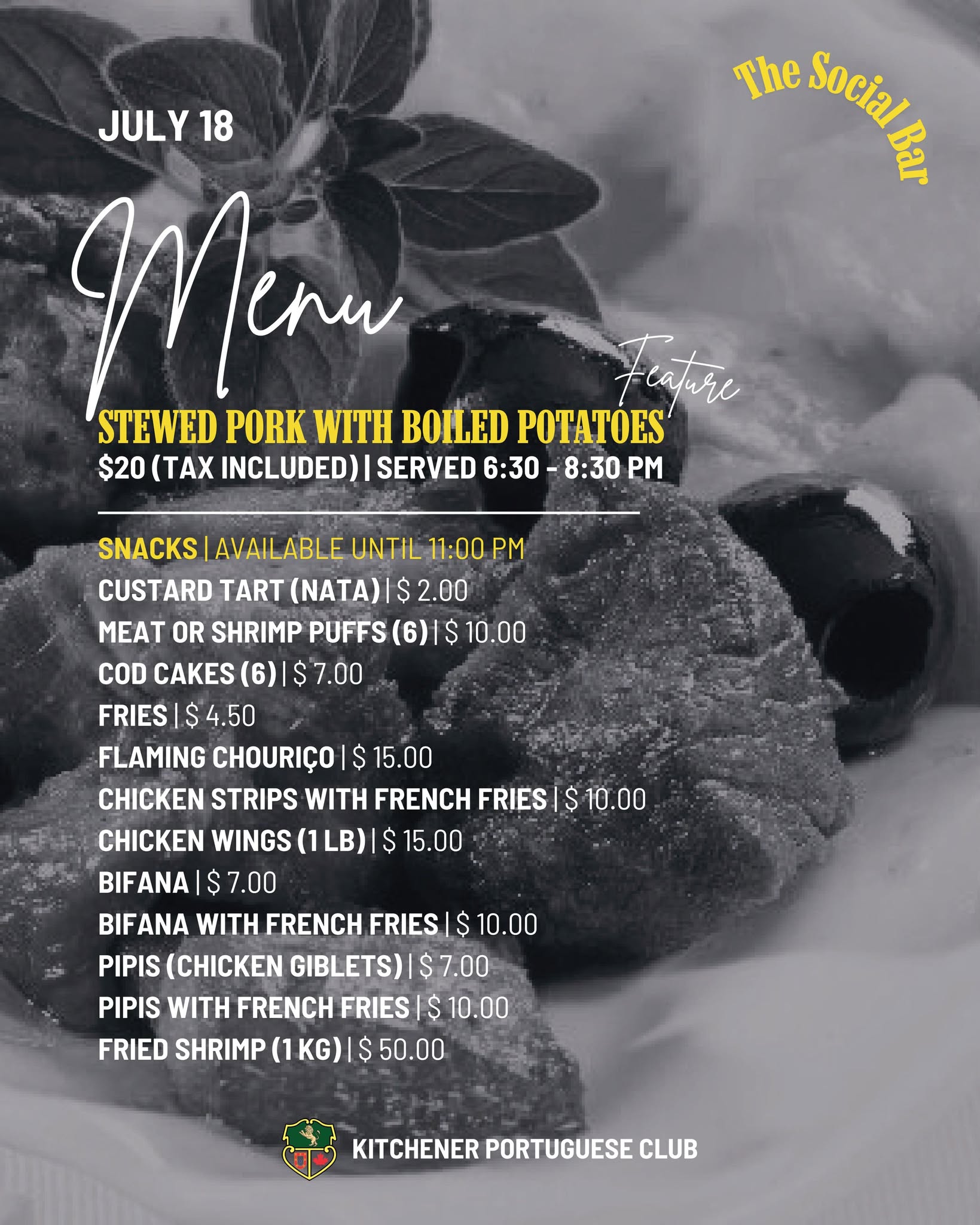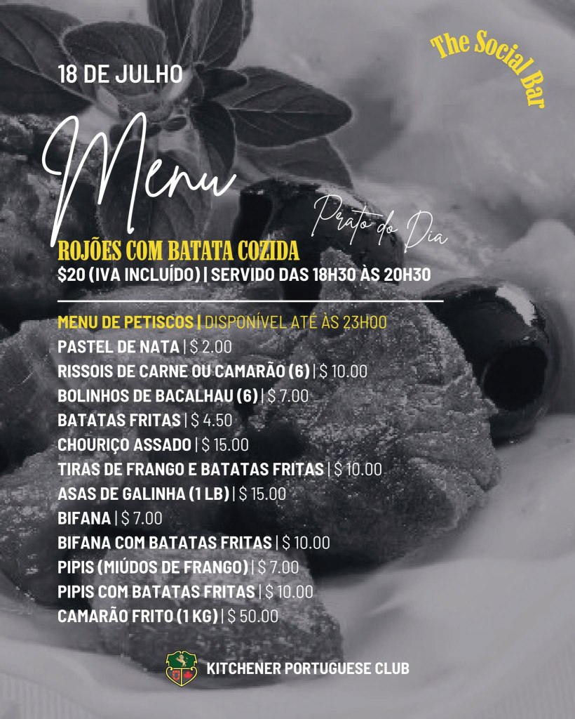 The Kitchener Portuguese Club, would like to see you all join us in our Social Bar, for Friday dinner this week, July 18th, 2025.