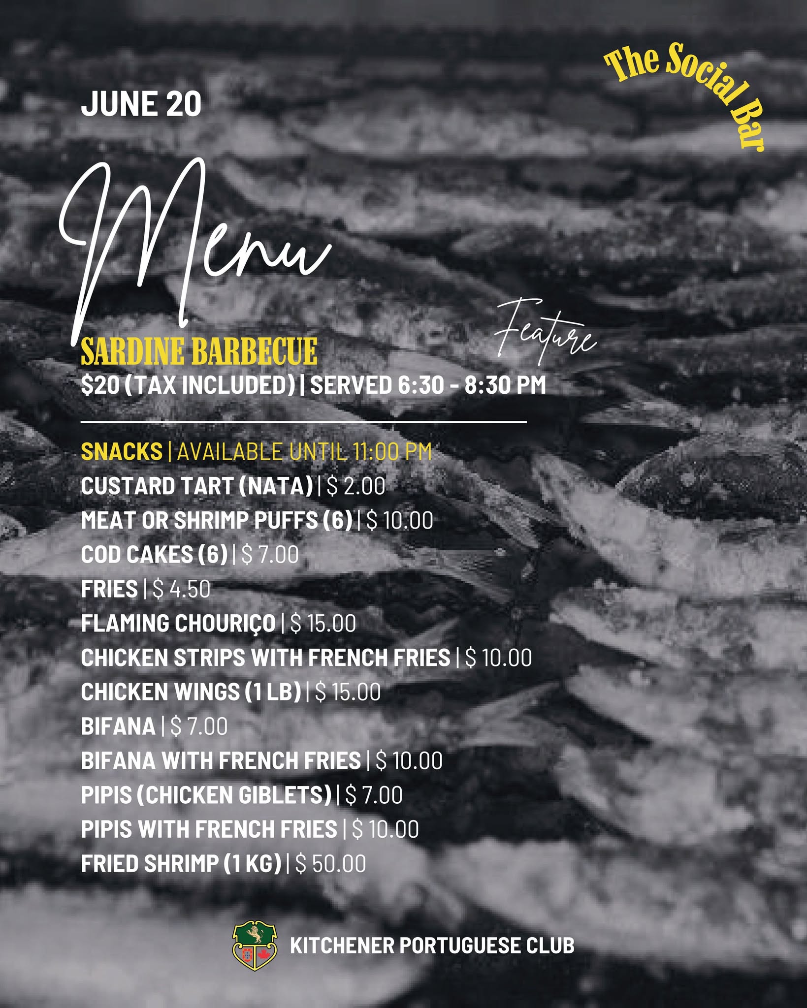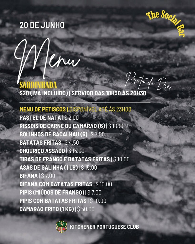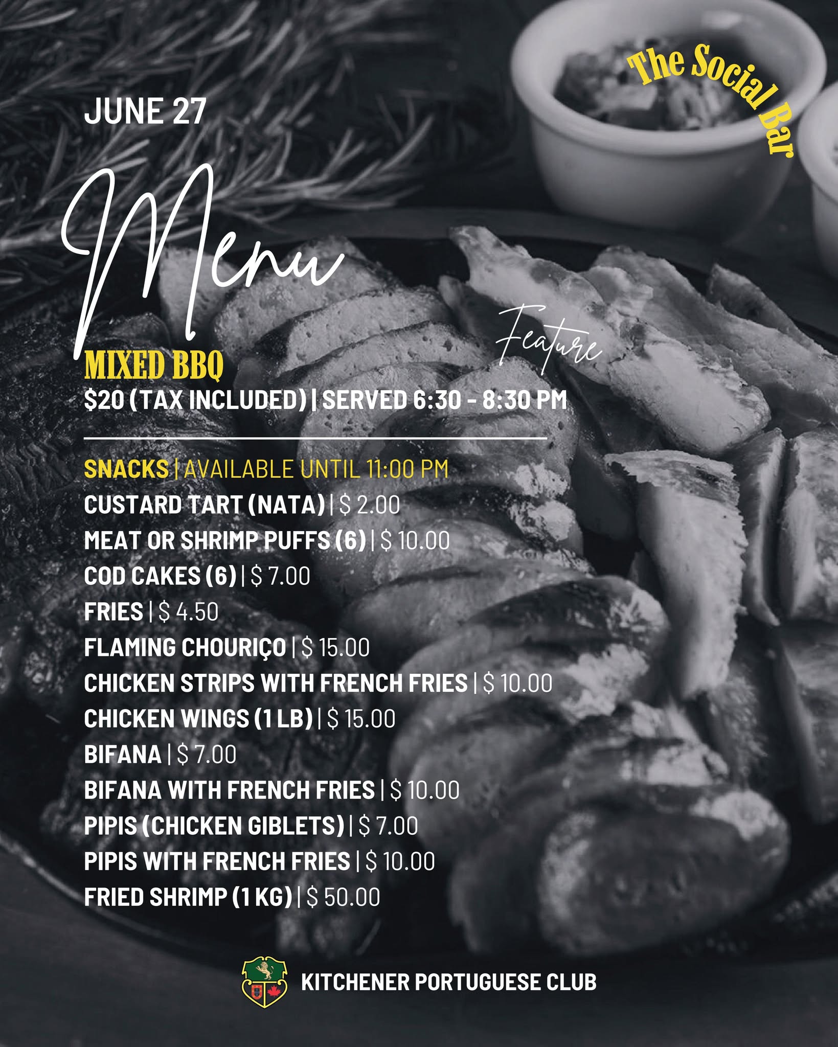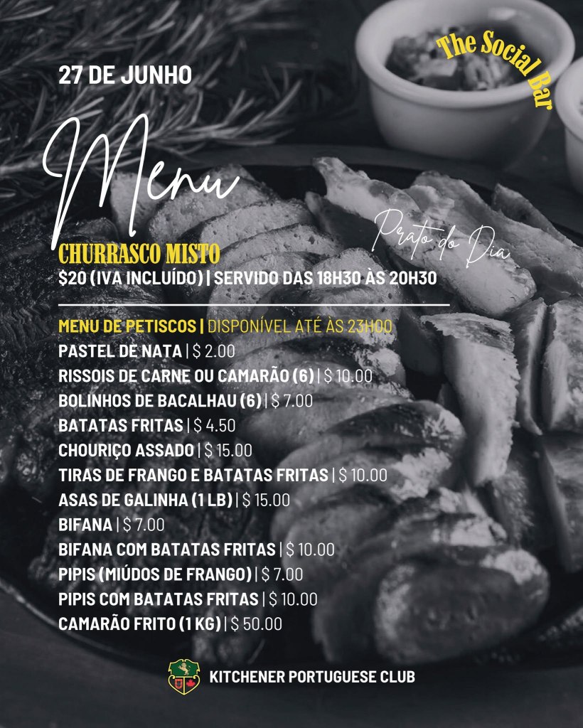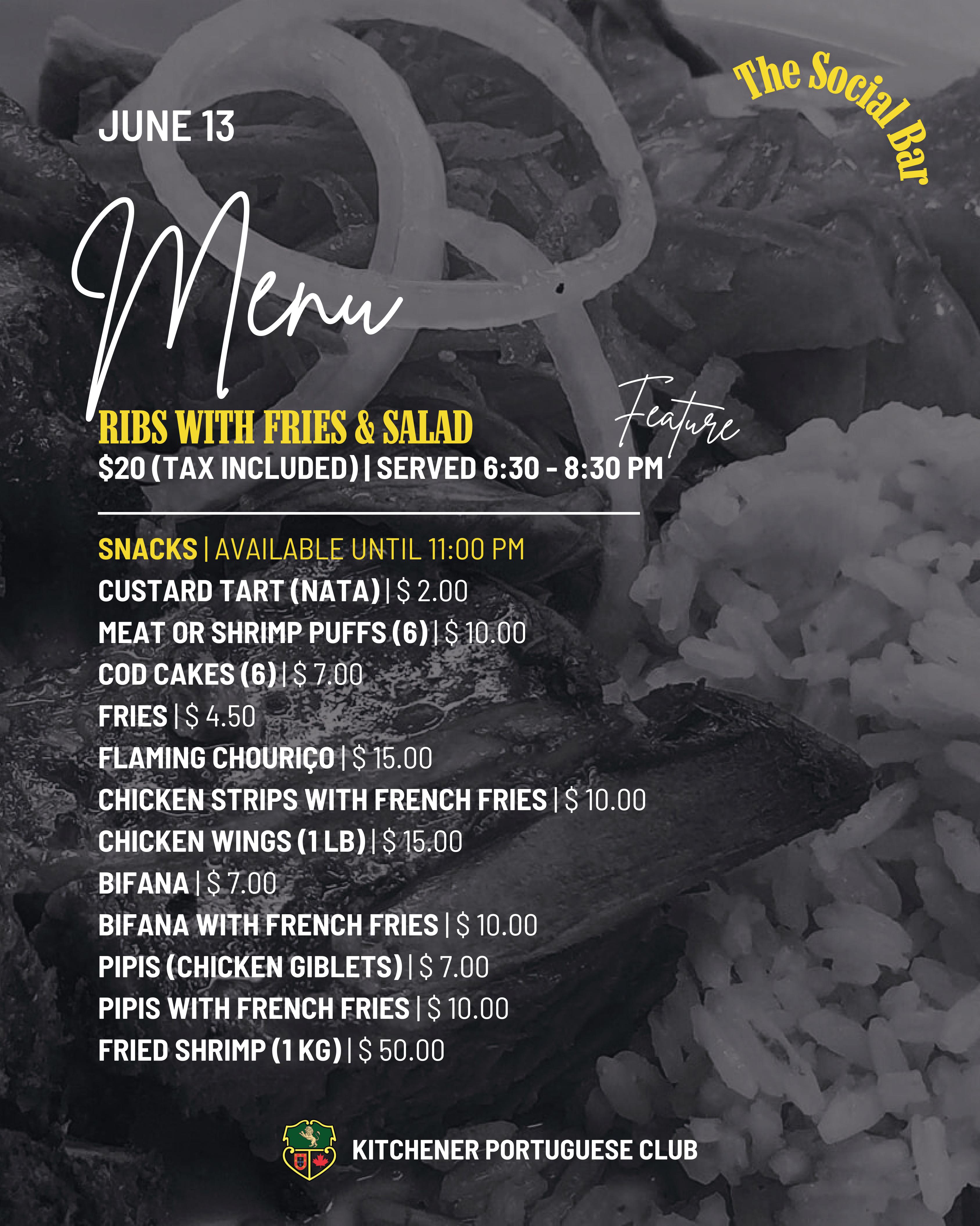 The Kitchener Portuguese Club, would like to see you all join us in our Social Bar, for Friday dinner this week, July 18th, 2025.