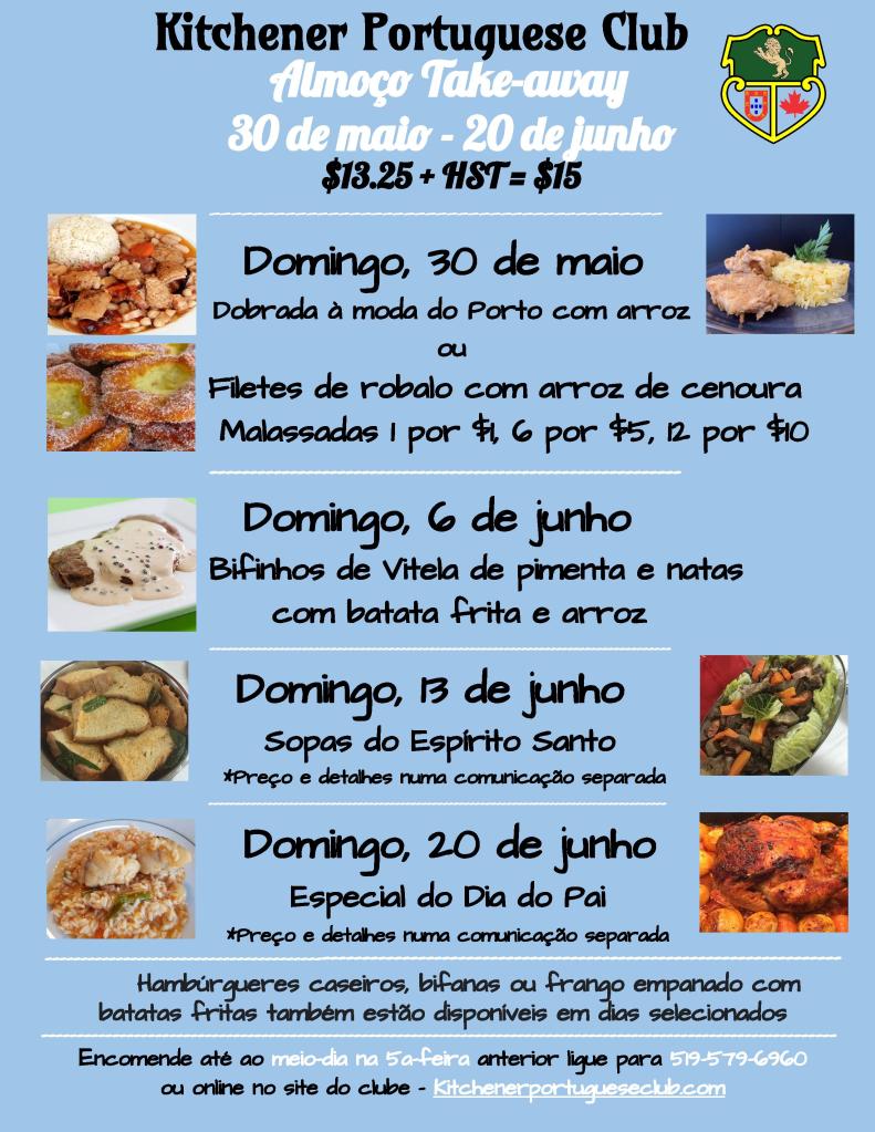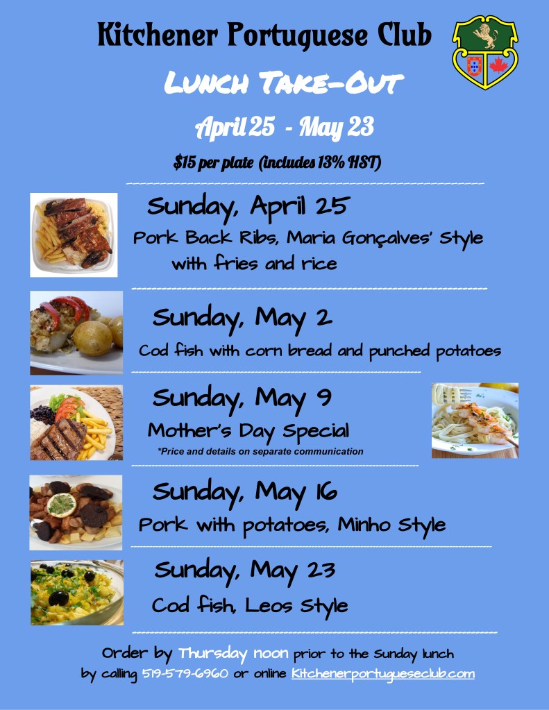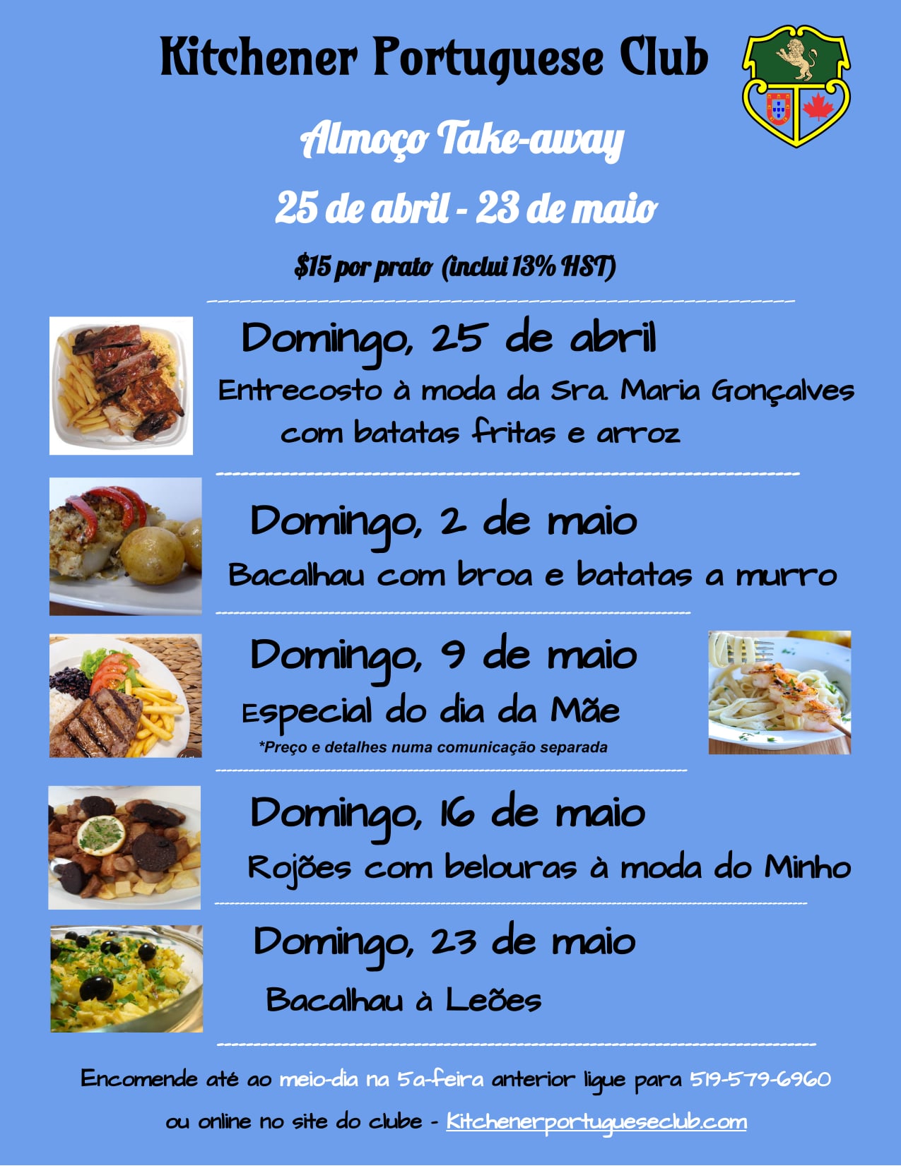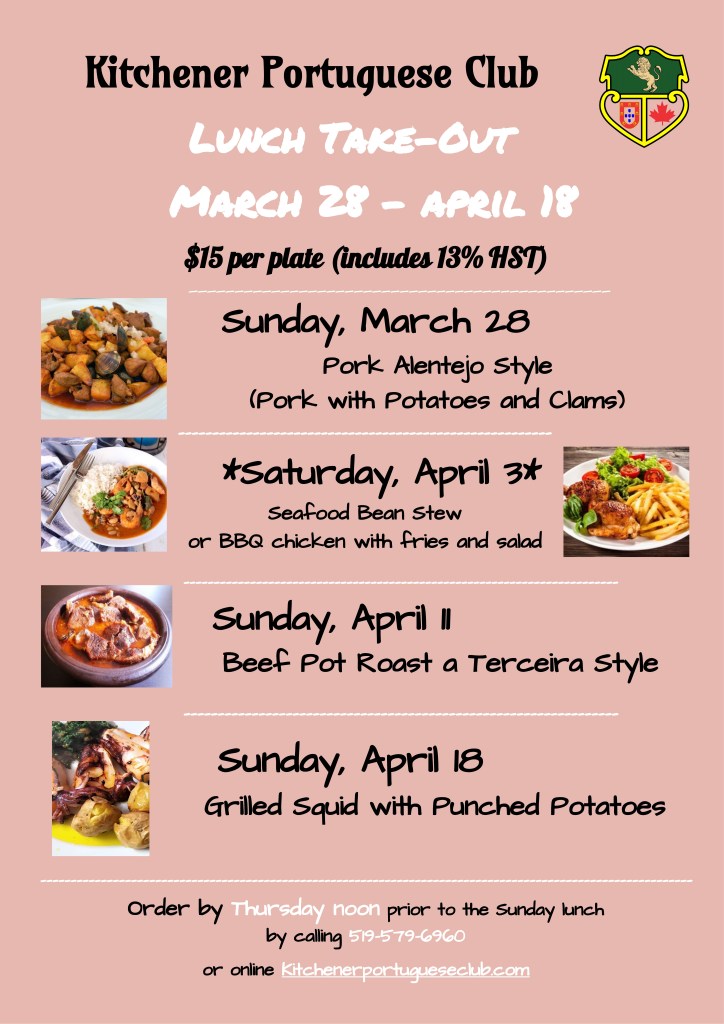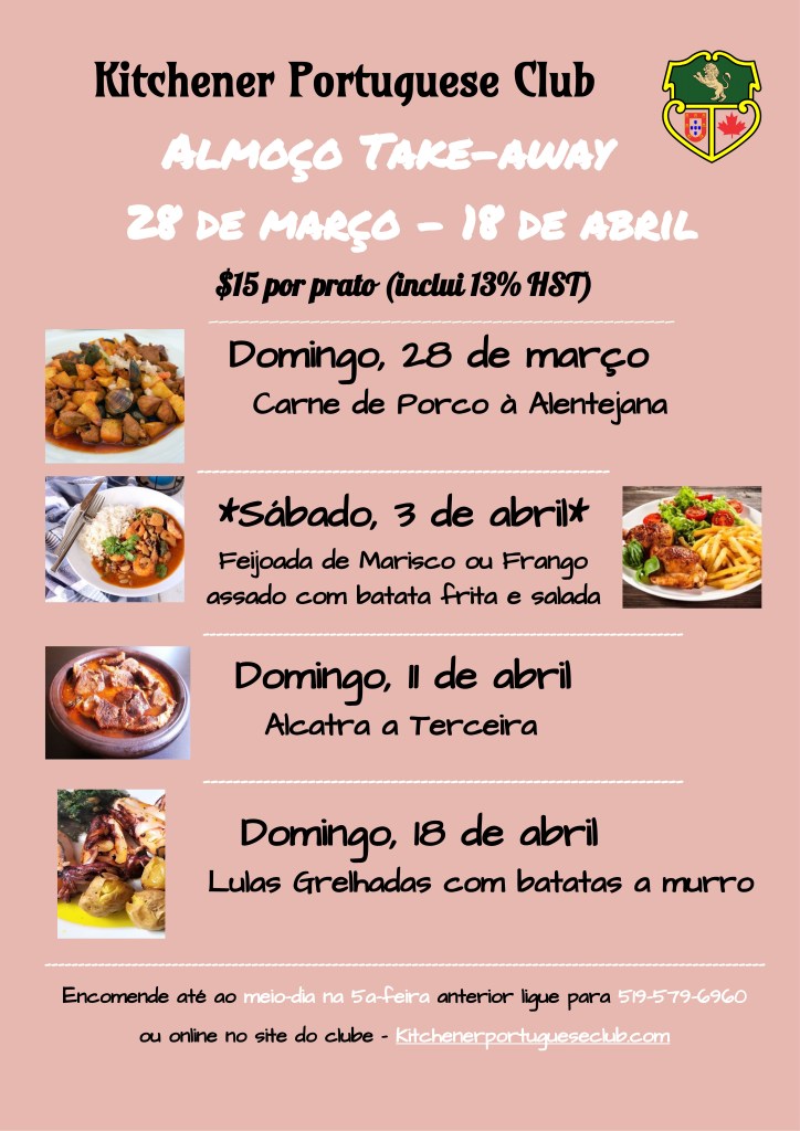Faça a sua encomenda até às 12H da 5a-feira, dia 6 de maio. para 519-579-6960 ou online através deste link https://tinyurl.com/KPCITakeout. Pedidos depois da 5a-feira dependerão da disponibilidade.
