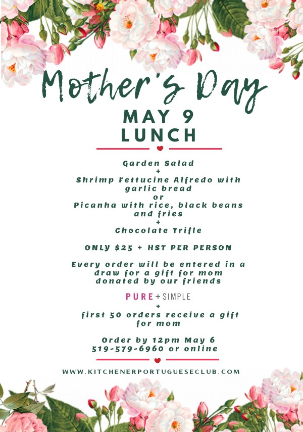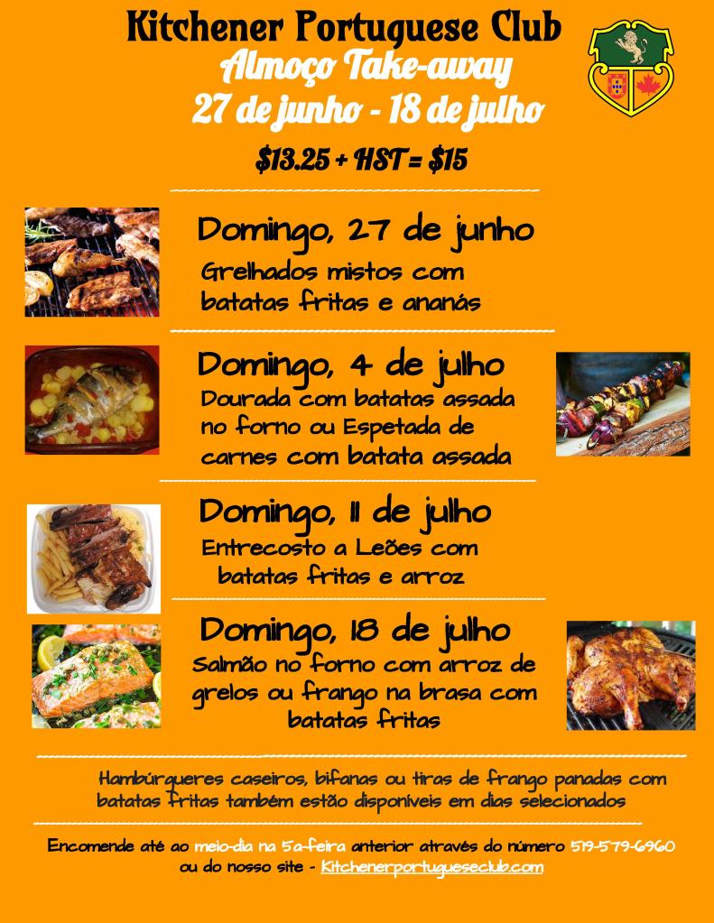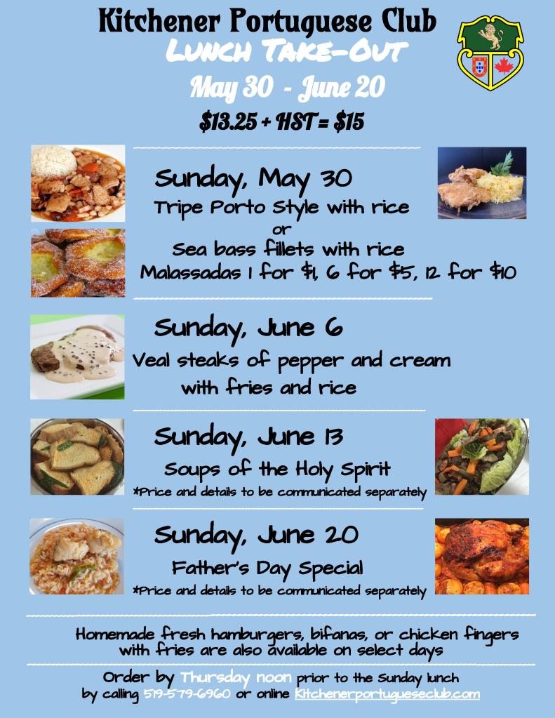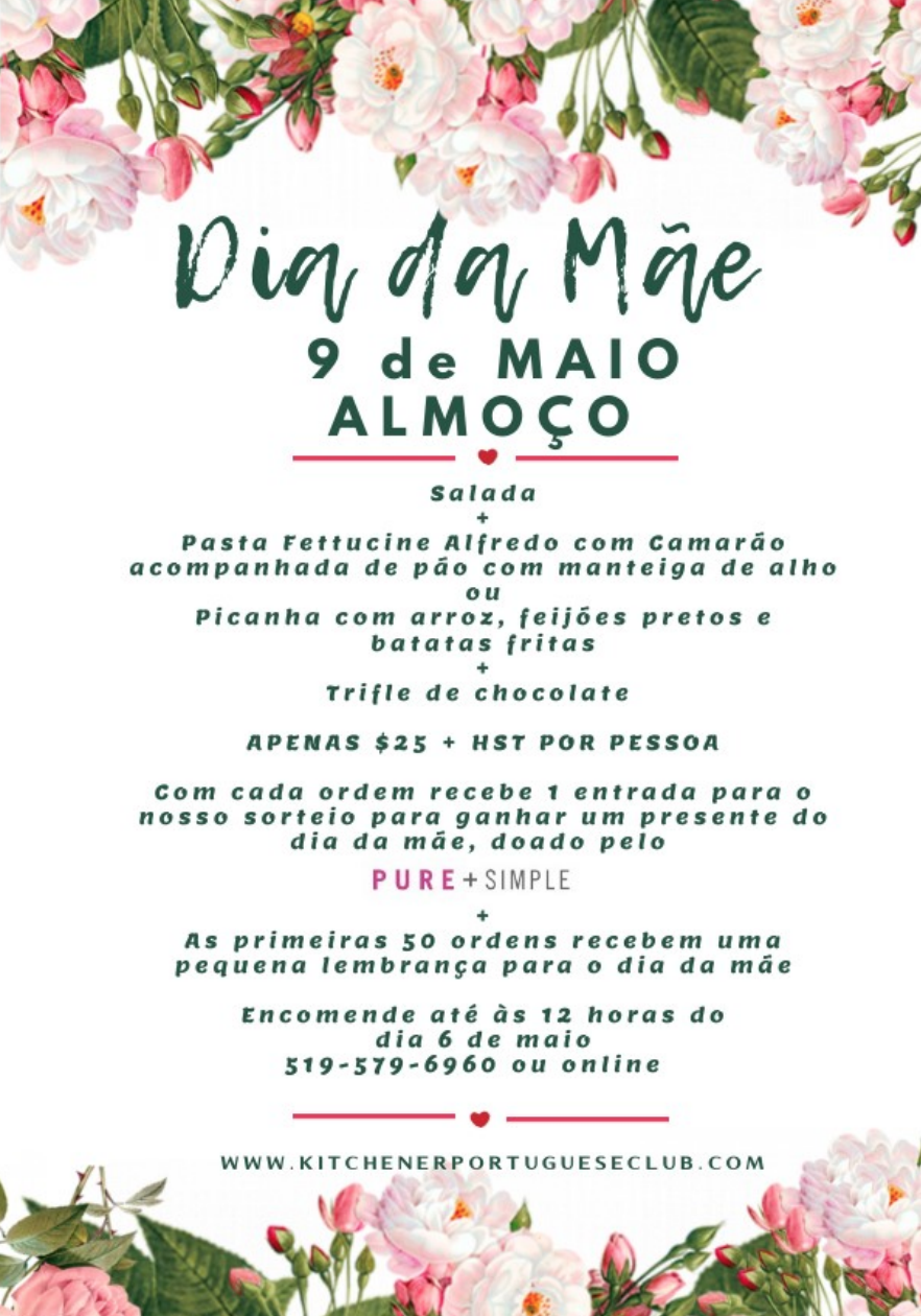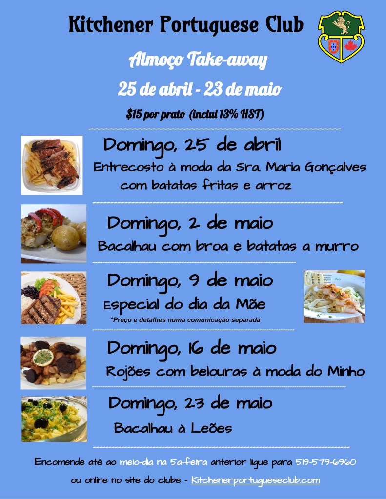 Faça a sua encomenda até às 12H da 5a-feira, dia 6 de maio. para 519-579-6960 ou online através deste link https://tinyurl.com/KPCITakeout. Pedidos depois da 5a-feira dependerão da disponibilidade.