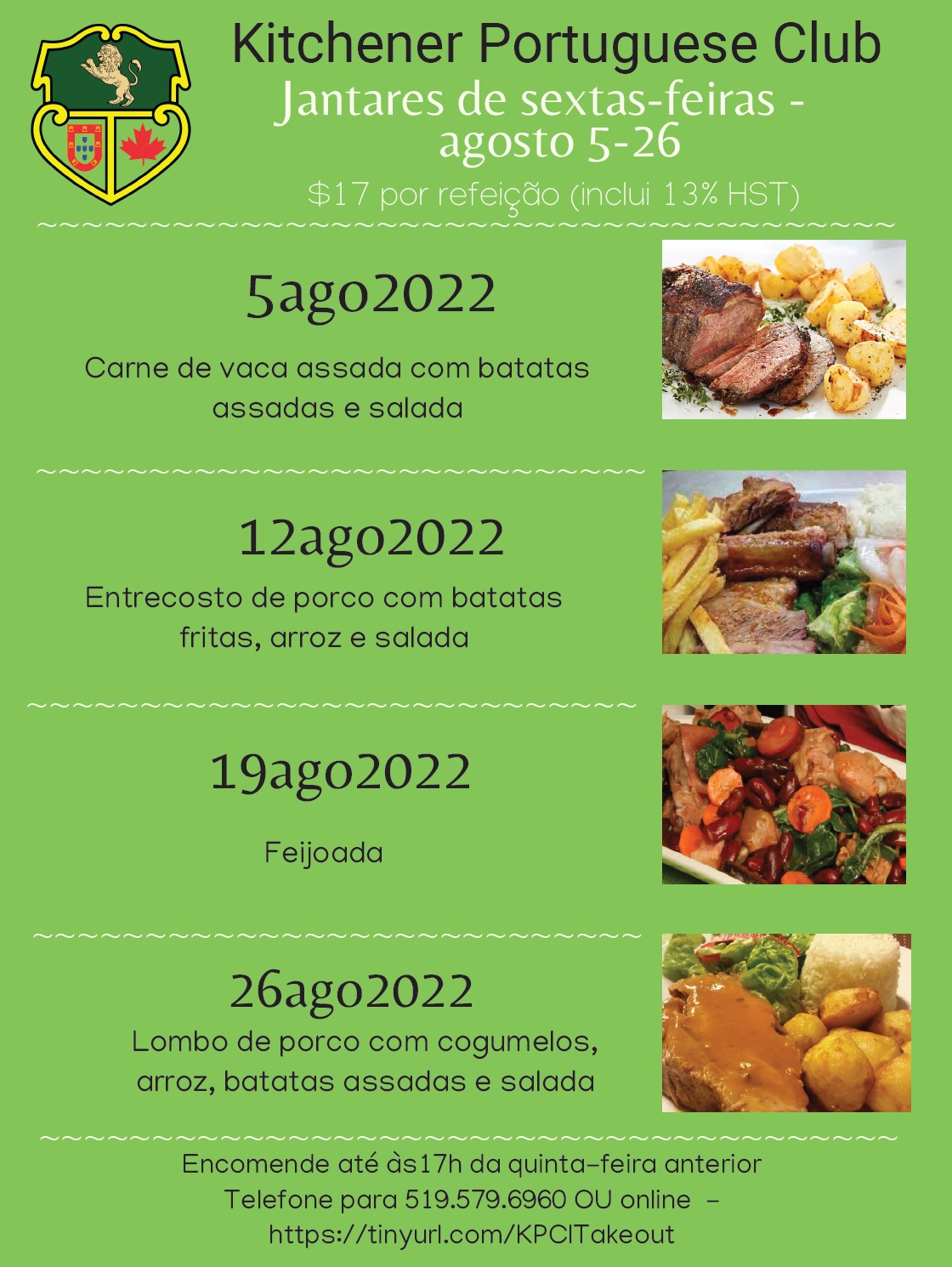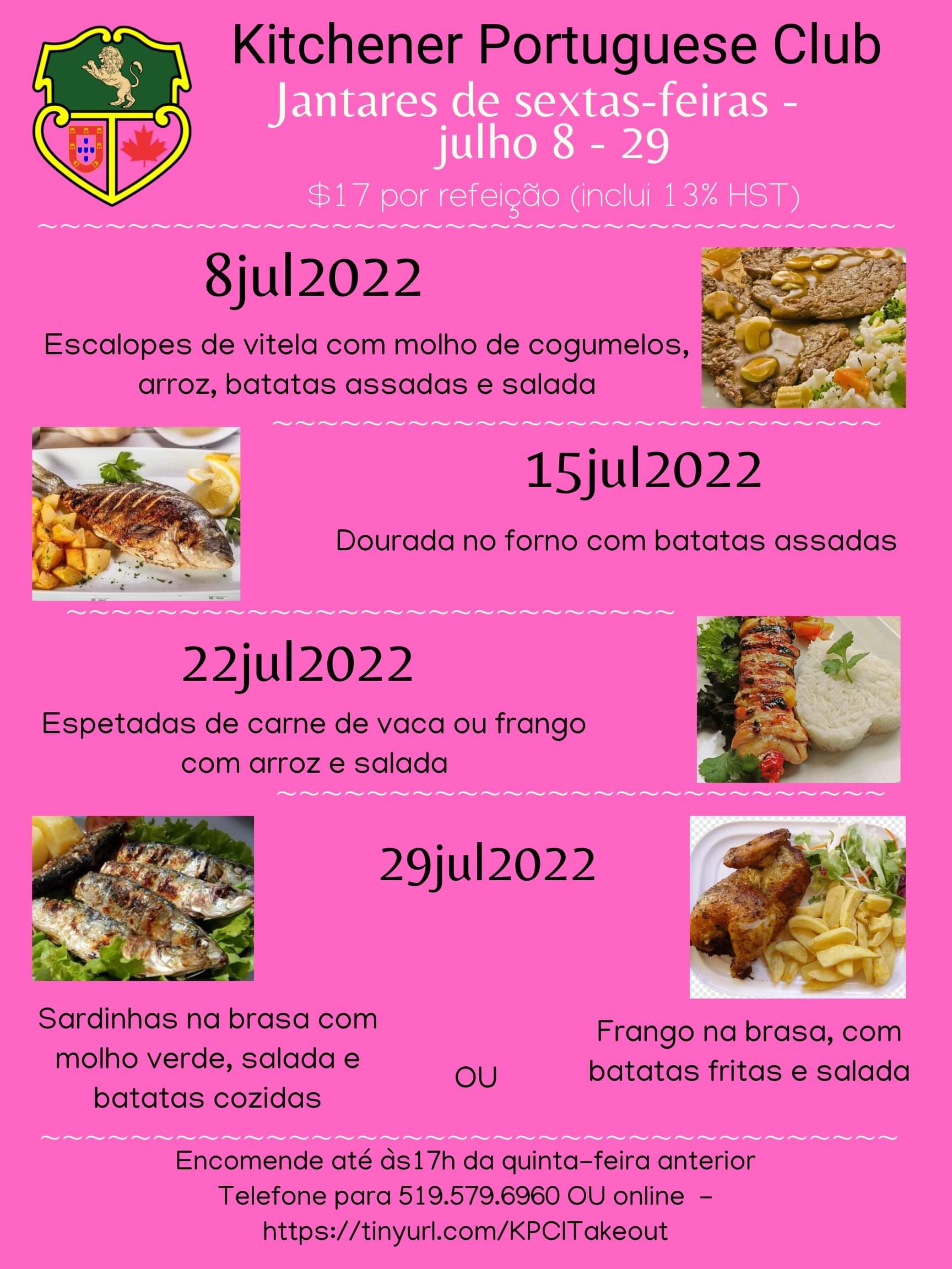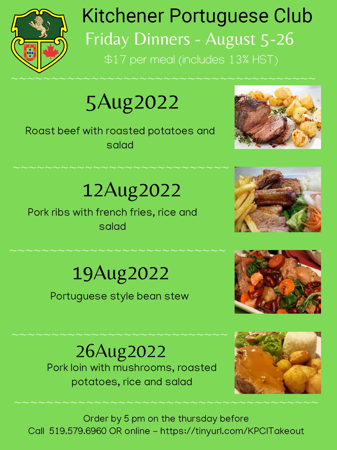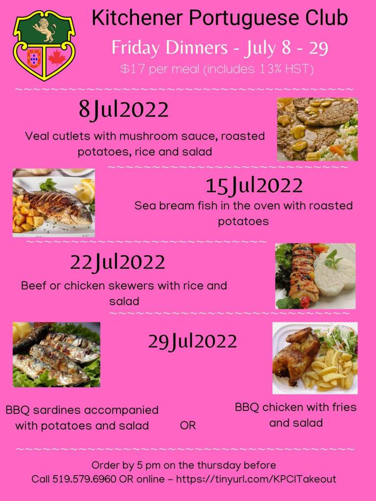 Faça a sua encomenda, para comer no salão ou para Take-Away, até às 17h de quinta-feira através deste link https://tinyurl.com/KPCITakeout ou telefonando para o Clube – 519-579-6960.