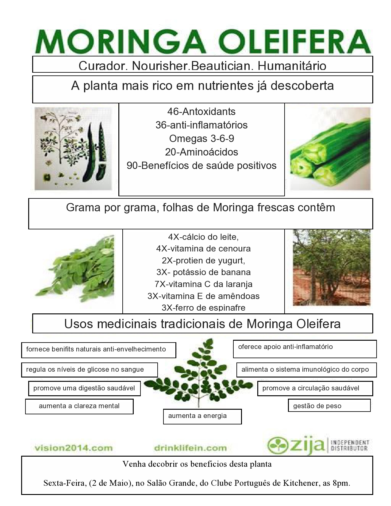 Want to learn about how the “Miracle Tree” Moringa Oleifera can benefit your health? Then visit the Kitchener Portuguese Club Inc, (1548 Fischer-Hallman Road, Kitchener – across from Williamsburg Cemetery) Tonight before 8pm, as we’ll have a small presentation there at 8pm!
